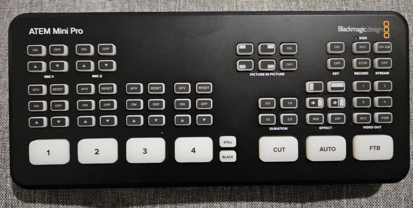 Blackmagic Design ATEM Mini Pro video mixer. It supports up to 4 HDMI inputs and has features like picture in picture, recording, and streaming