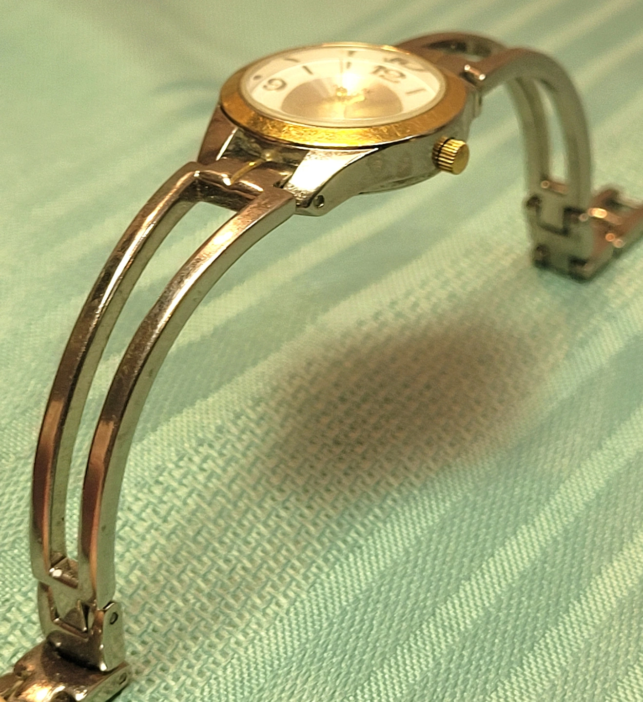 Band: Two-tone silver and gold-plated split-shoulder bangle/bracelet style.