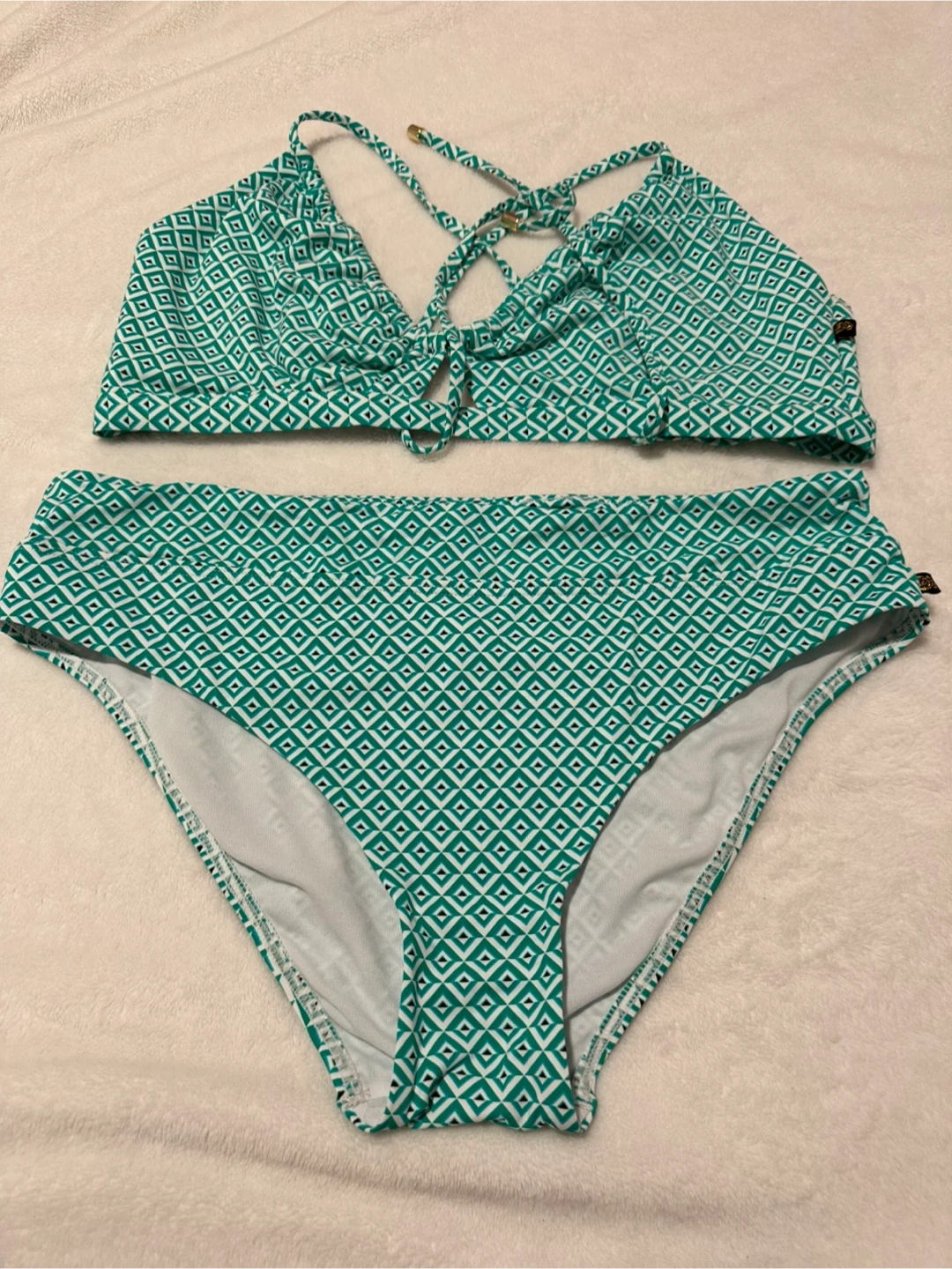 This La Vie en Rose Aqua bikini set features a vibrant geometric print in green and white. It's a size XL/TG. The bikini has a criss-cross back detail on the top and a comfortable fit on the bottoms.