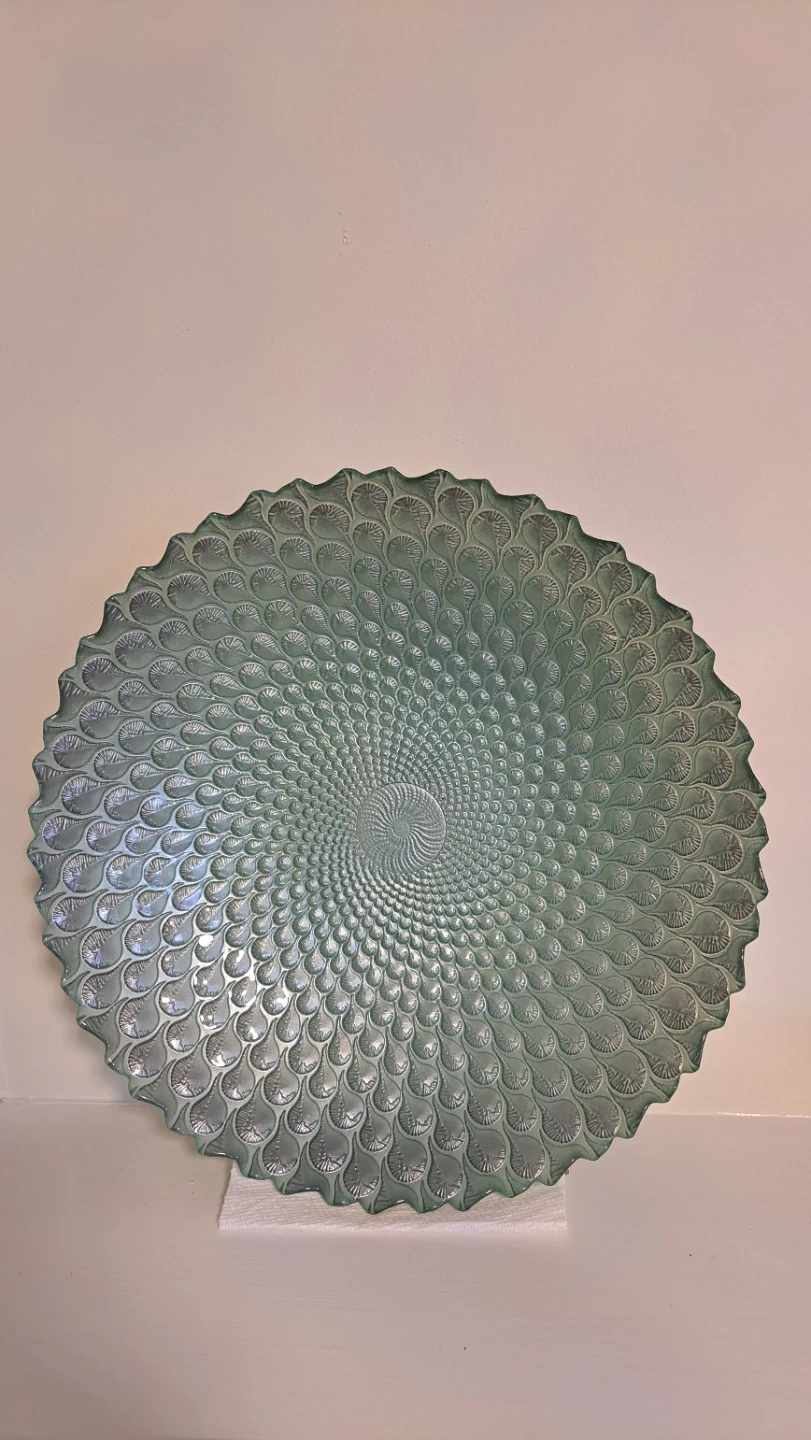 A decorative glass serving platter with a unique, embossed spiral peacock