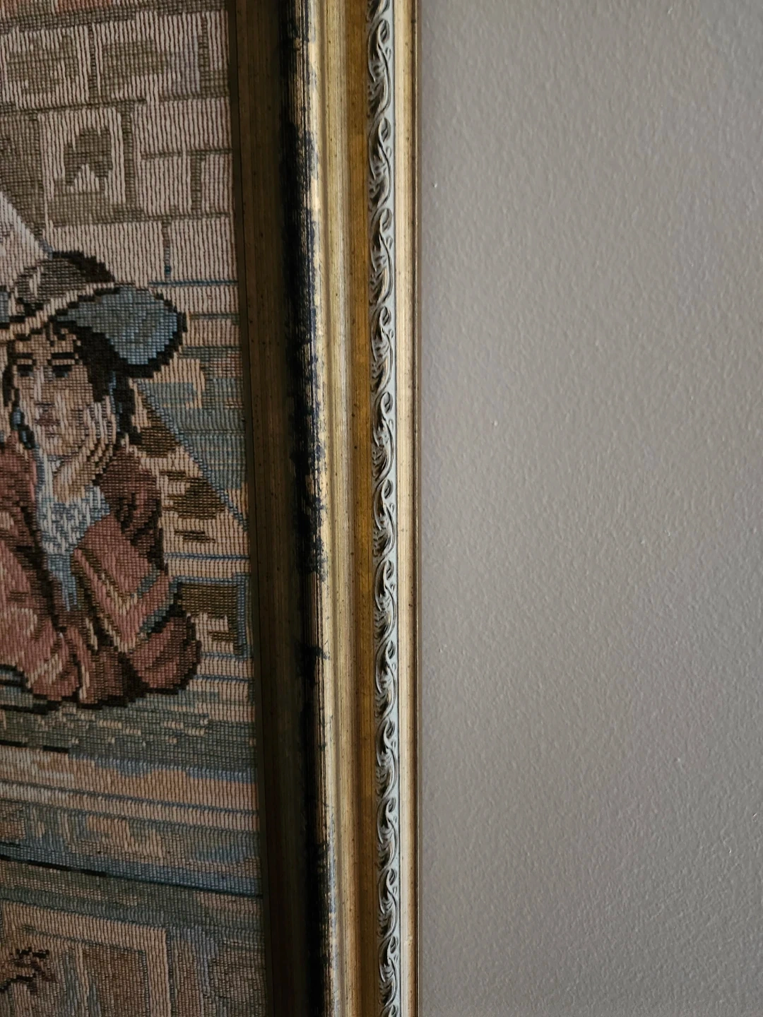 Beautifully framed Florintine original tapestry from Italy. Framed in antique wood. Measures 4'x8" H and 3'x5" W. Prestine condition. Already wired and ready to hang.