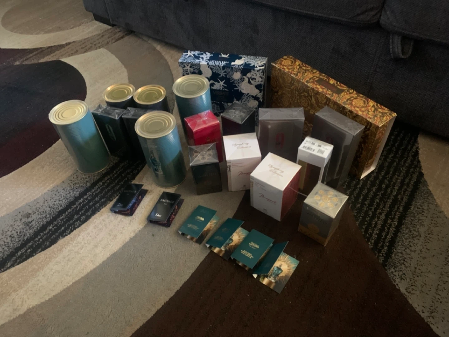 Collection of various perfume boxes and gift boxes. Includes cylindrical teal cans, decorative patterned boxes, and smaller perfume packaging. Some boxes display brand names like Dior and Emporio Armani. These are ideal for gifting or personal use.