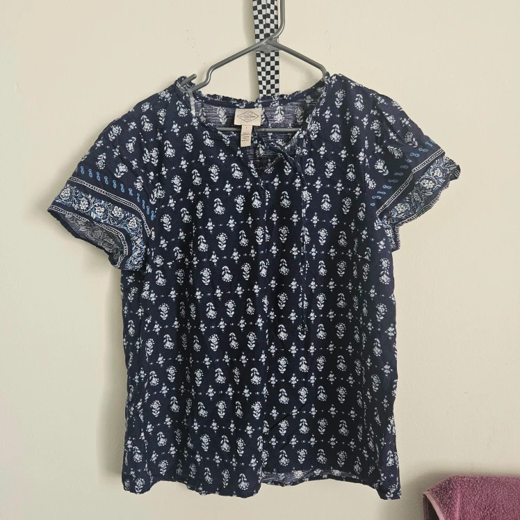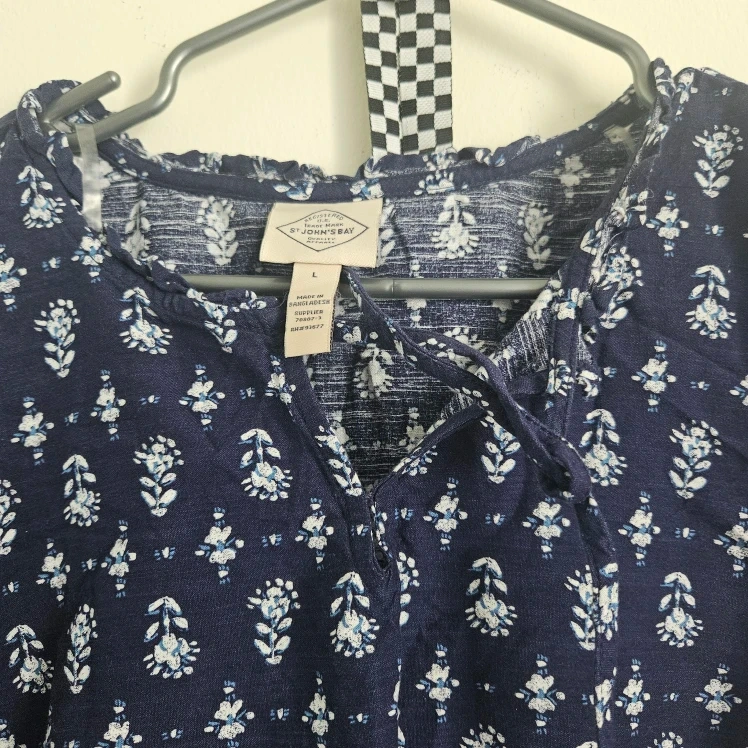 371Cute St. John's Bay blouse in a size large! I got it from JC Penney last month. It's a navy blue colour with a white floral pattern. The material is lightweight and comfy, perfect for summer days. Washed once before trying it on and realizing it's not for me 😠Pick up in Parkwoods or Fairview Mall. Can be bundled with other listings. Smoke and pet free household.