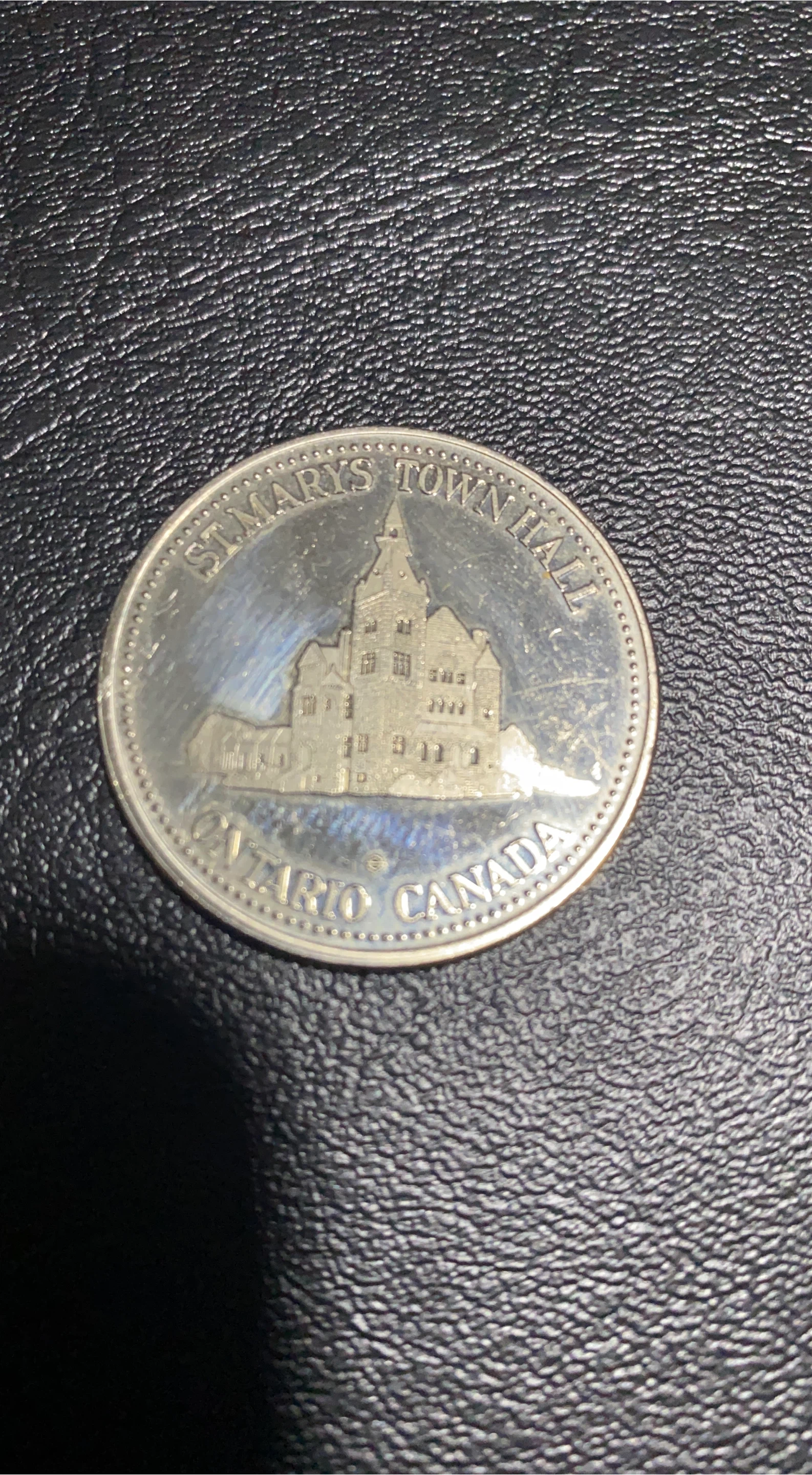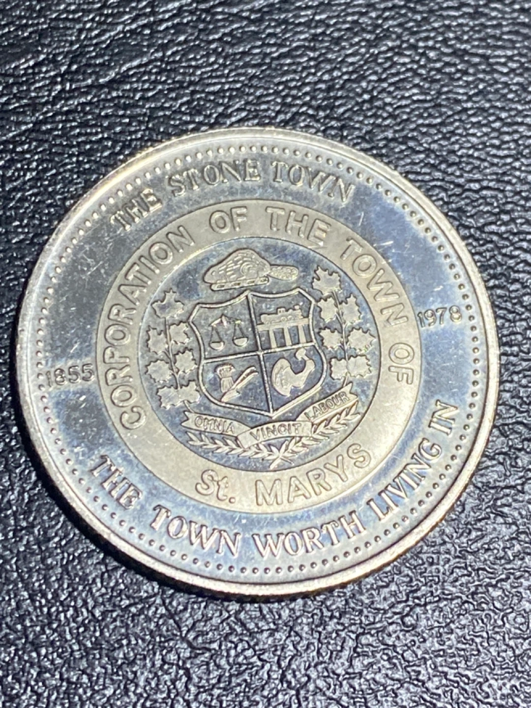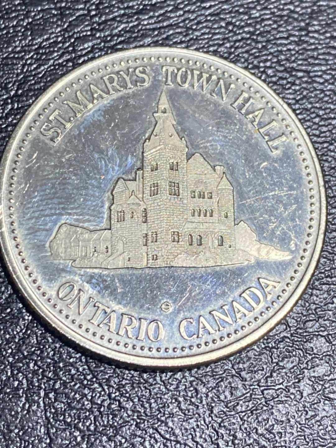 Selling a commemorative coin featuring St. Marys Town Hall in Ontario, Canada. The coin also features the Corporation of the Town of St. Marys coat of arms and the year 1978.