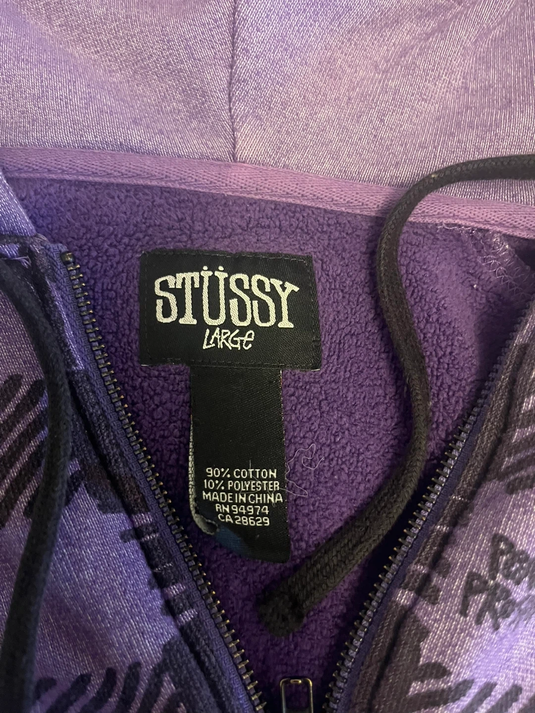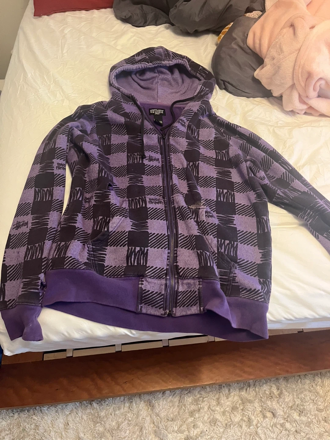 Selling a Stüssy zip-up hoodie in a cool purple plaid pattern! It's a size large and made of 90% cotton and 10% polyester. It's in great condition and perfect for layering or wearing on its own. The Stüssy logo is on the tag. This hoodie is sure to keep you cozy and stylish!