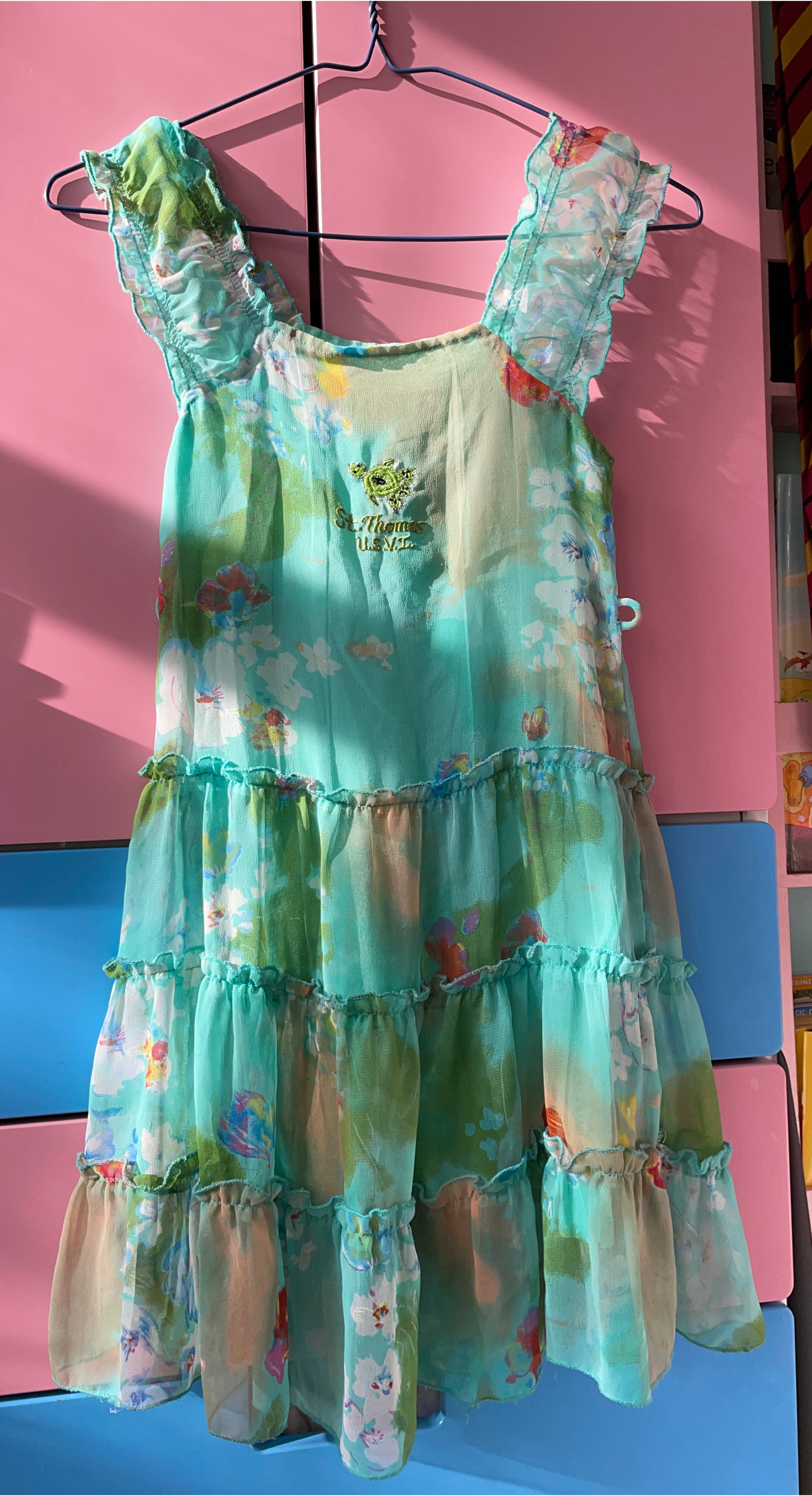 Cute St. Thomas U.S.V.I. dress with a lovely floral pattern. It's perfect for a sunny day out or a special occasion. The dress features a tiered design and ruffled sleeves, adding a touch of elegance to the overall look