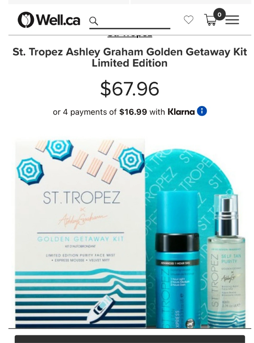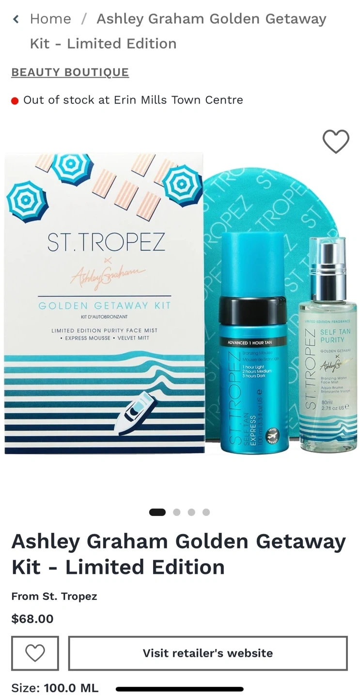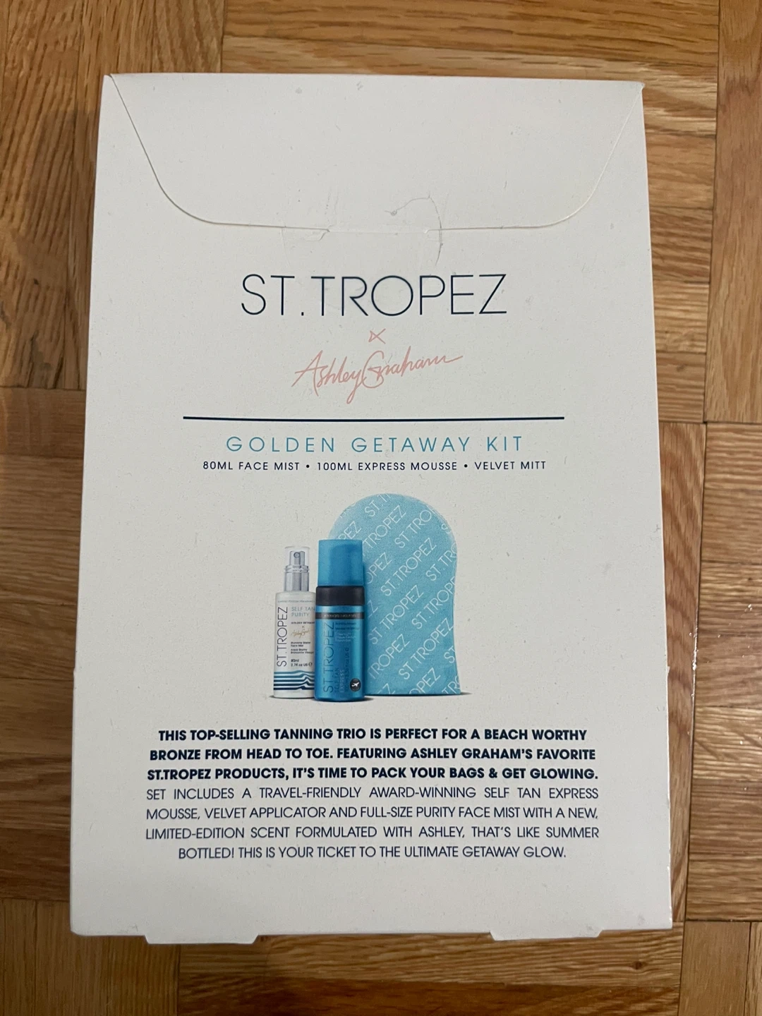 60Selling a St. Tropez x Ashley Graham Golden Getaway Kit! This kit includes a limited-edition purity face mist, express mousse, and a velvet mitt. It's perfect for achieving a beach-worthy bronze from head to toe. This set includes a travel-friendly award-winning self-tan express mousse, velvet applicator and full-size purity face mist with a new, limited-edition scent formulated with Ashley. Brand new-unopened. Sells for $68 + tax!
