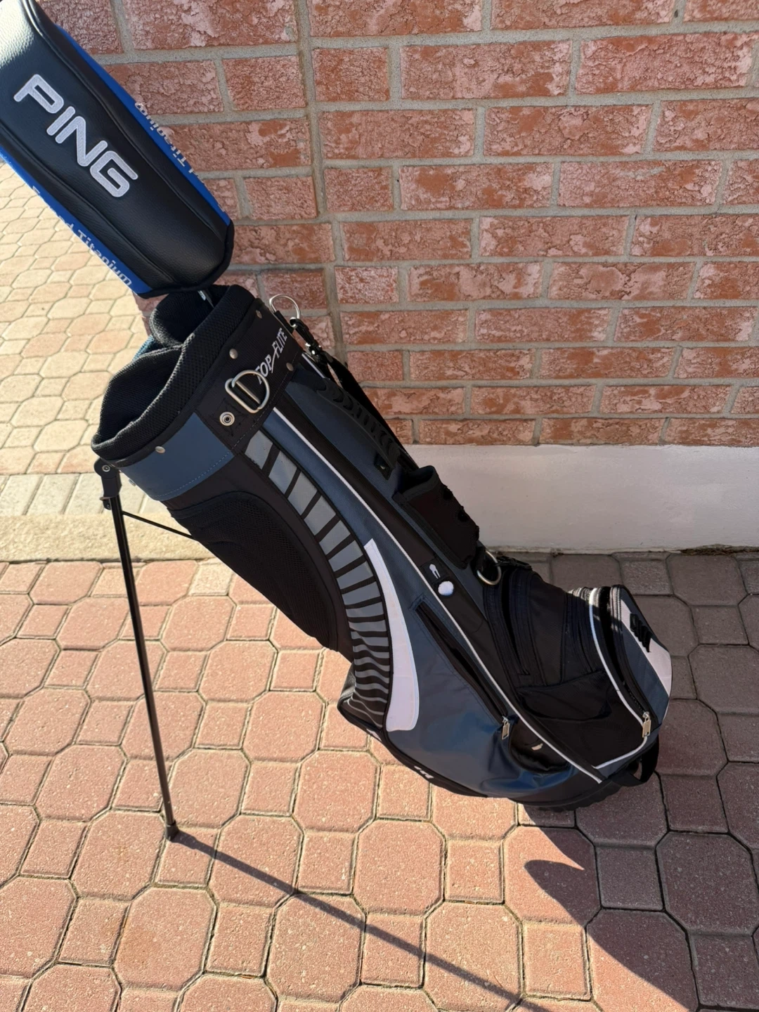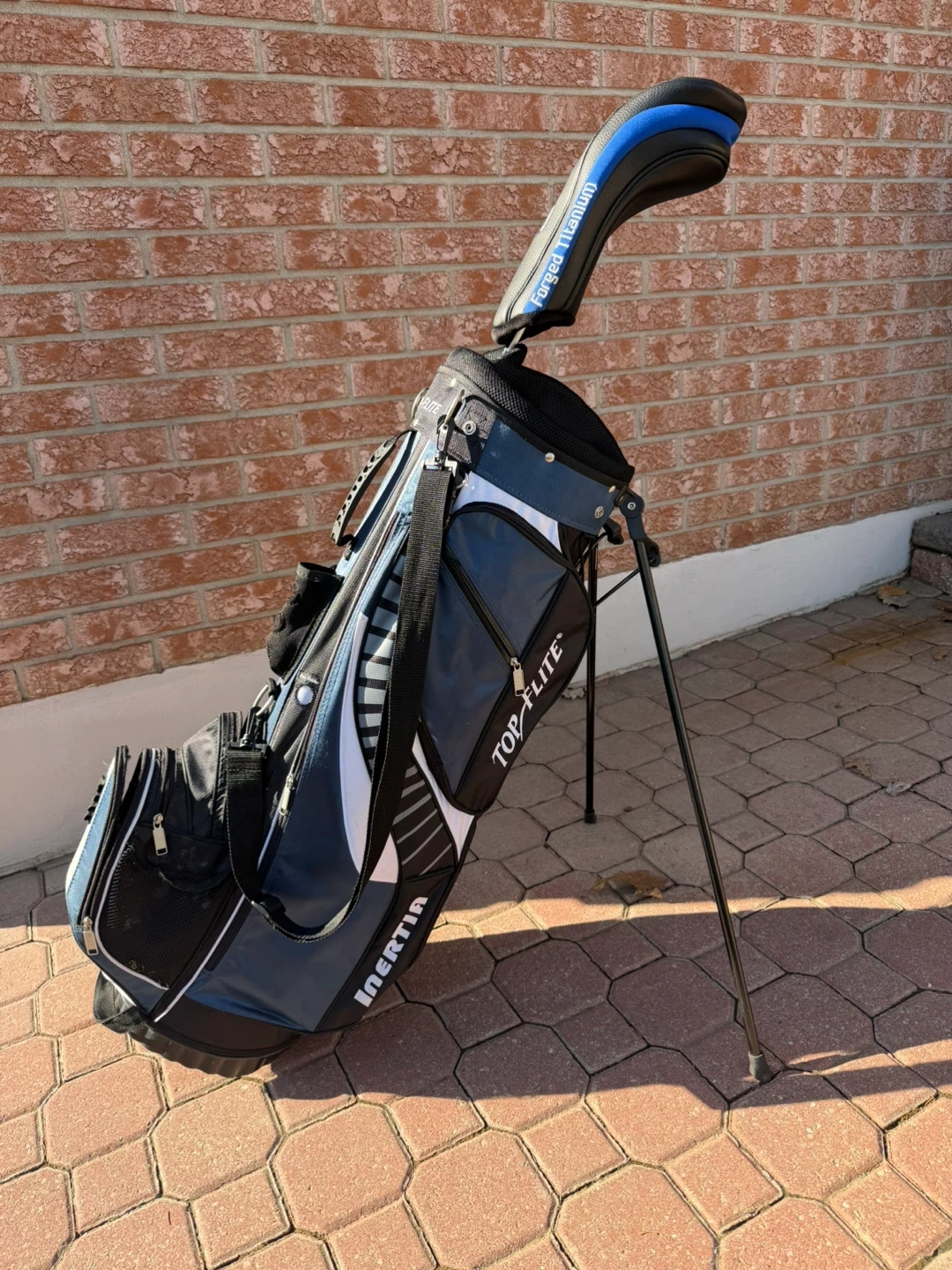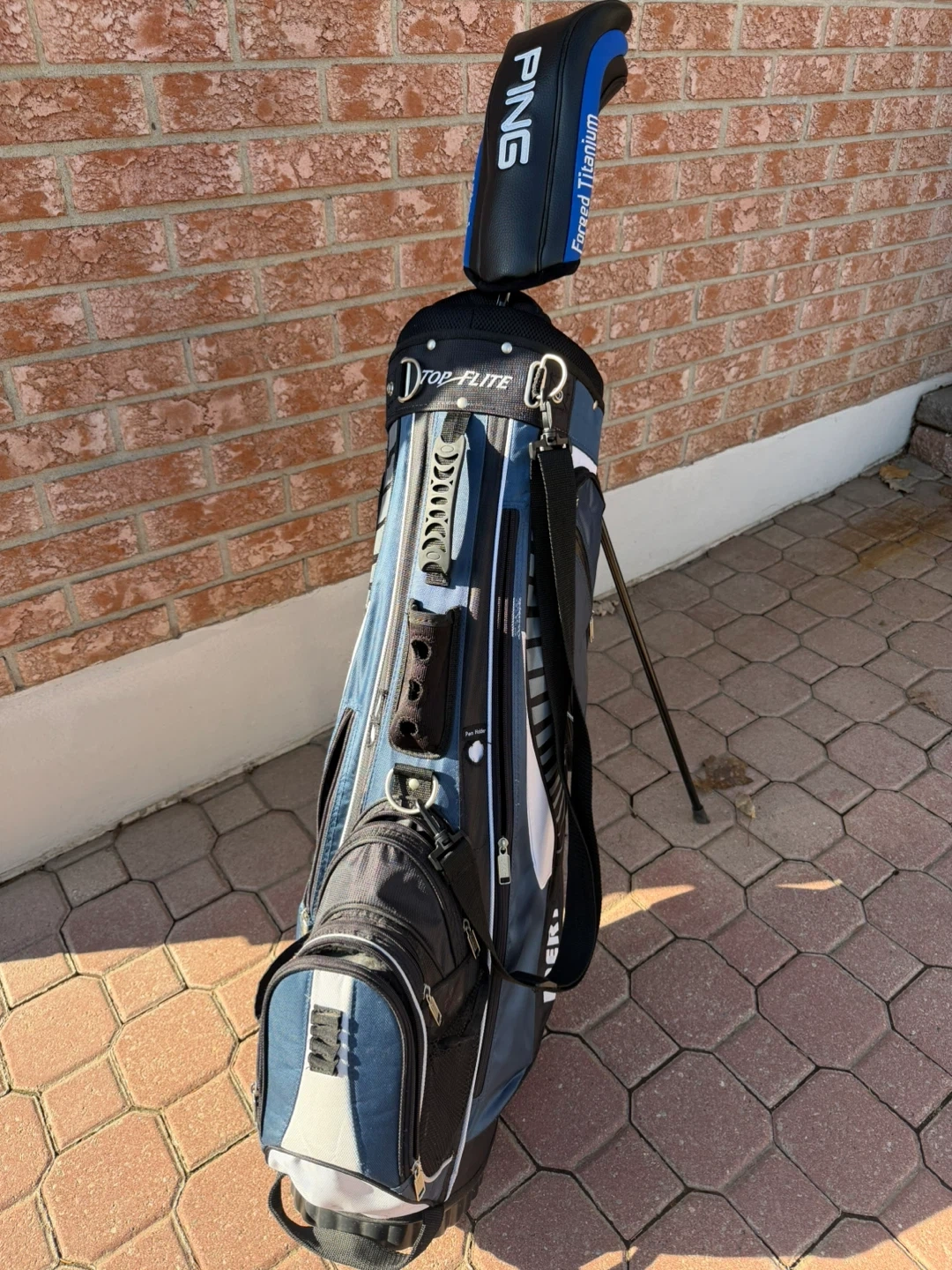 This Top Flite Inertia stand golf bag is blue and black. It features multiple pockets and a stand. It's designed for easy transport and organization on the course. Also comes with free ping driver