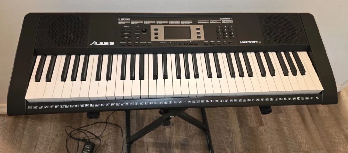This Alesis Harmony 61 keyboard is a fantastic starter instrument with 61 keys. It comes with an adjustable x-style keyboard stand for easy setup. Perfect for learning to play music!