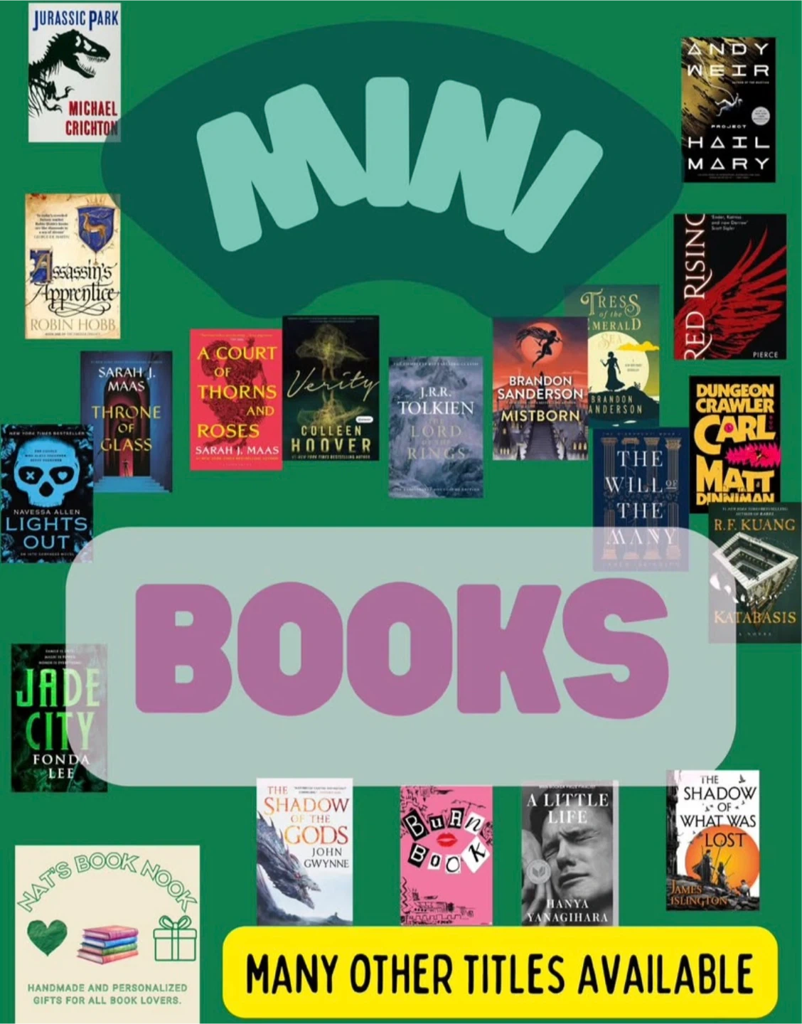 Browse a selection of mini books from various authors and genres. Prices start at $4.50 for one book, with discounts for multiple purchases. Many other titles are available, perfect for any book lover.
