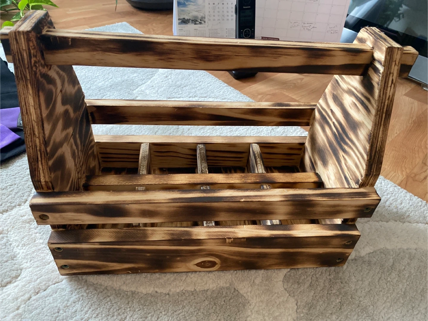 This is a rustic wooden crate carrier with a handle. It has four compartments inside. Made of wood with a burnt finish.