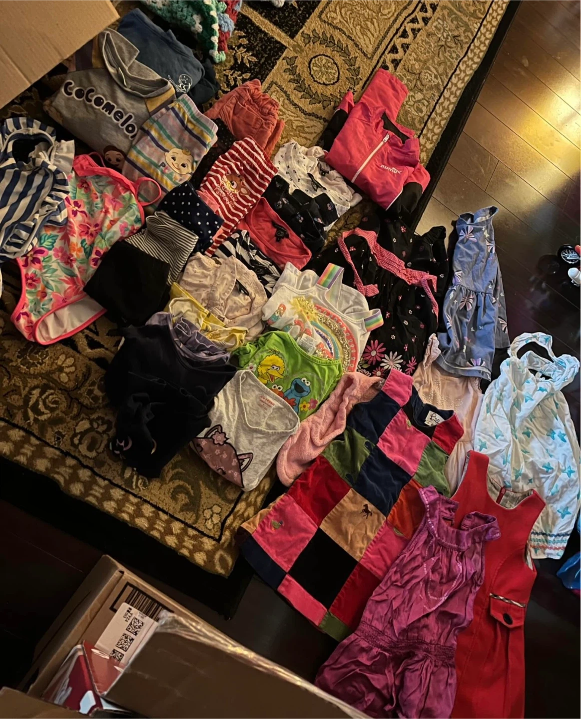 Bundle of assorted girls' clothing items including tops, dresses, and a jacket. Features various prints and colours. Great for everyday wear!