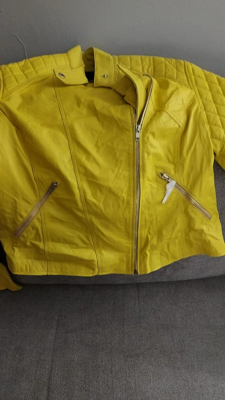 Bright yellow faux leather motorcycle jacket with zip-up closure. It's got a stylish design with quilted shoulders and zippered pockets. This jacket's a fun pop of colour for any outfit!