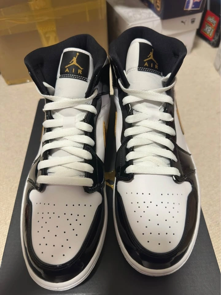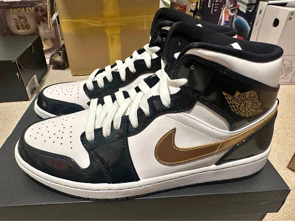 Fresh Air Jordan 1 Mid SE kicks. Black, metallic gold, and white colorway. Men's size 10.5. Comes with original box. These are in amazing shape.