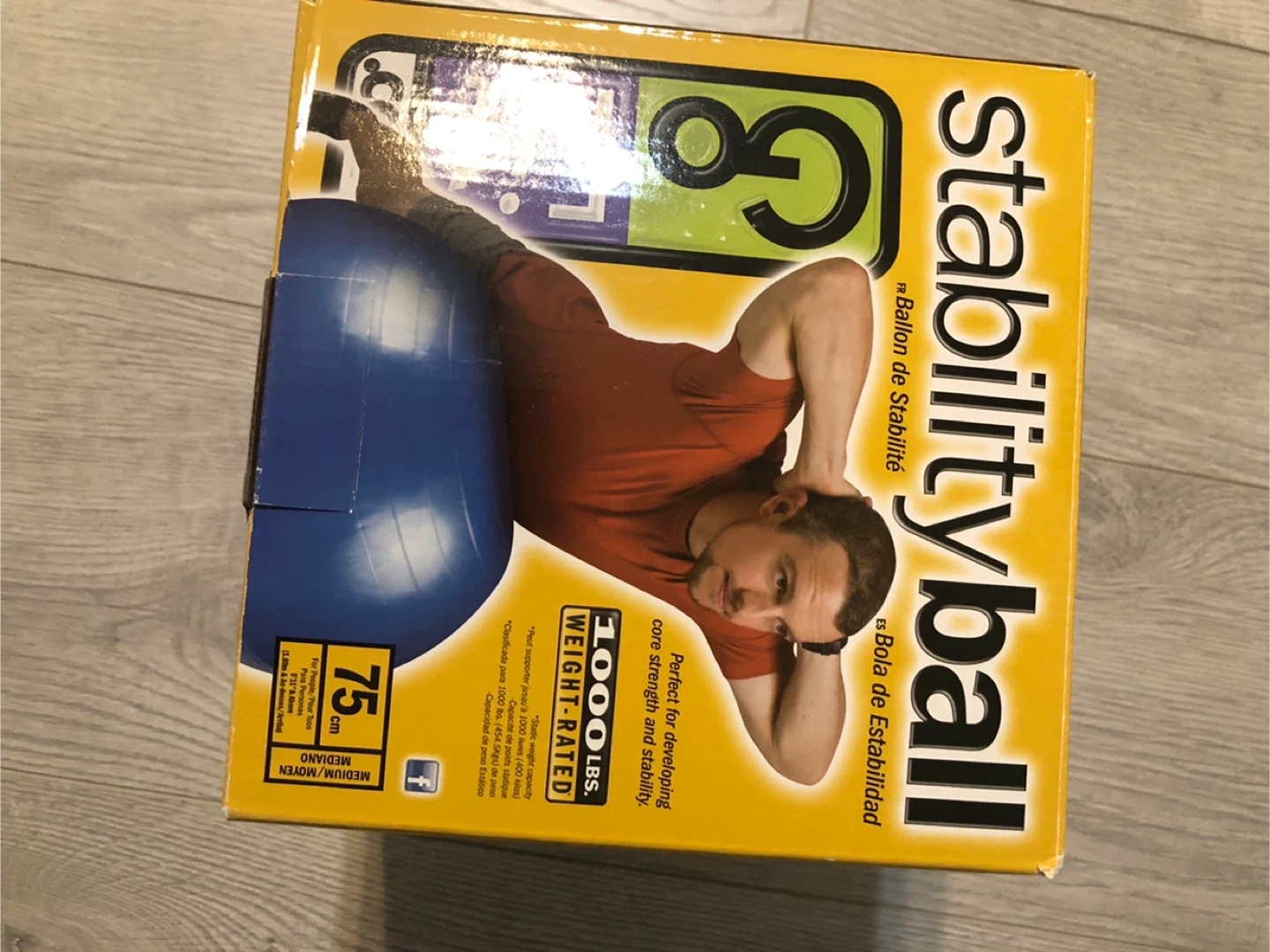 Selling a stability ball, size 75cm, which is a medium/mediano size. It's perfect for developing core strength and stability. It can support up to 1000 lbs! The box is included