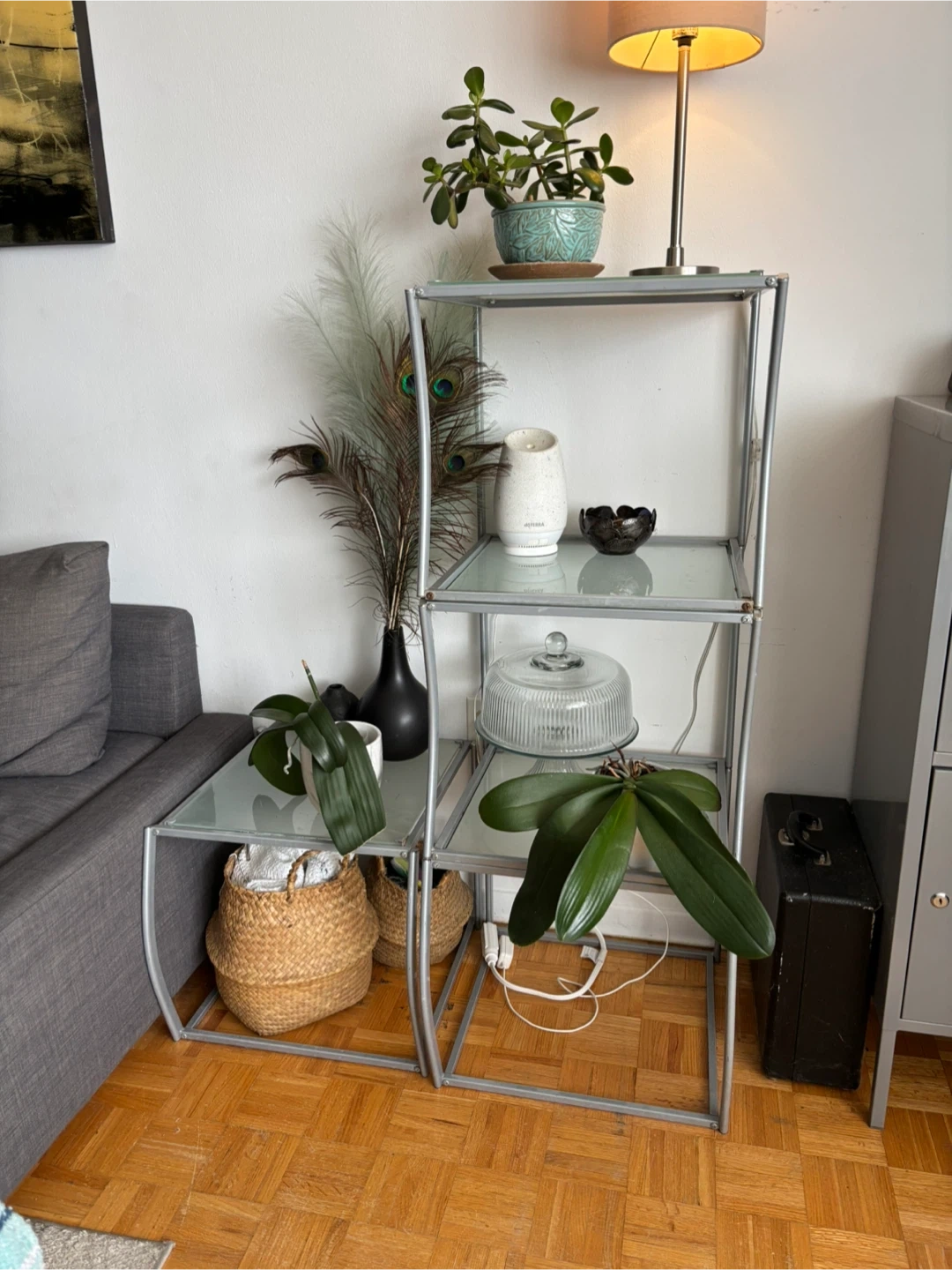 68Selling a stylish glass shelf unit! It's in great shape and perfect for displaying your favourite items or plants. It has a sleek design that would fit into any room. There are 4 separate pieces that can be stacked however you like.