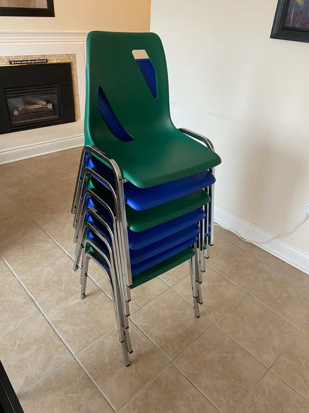 Selling a set of stackable chairs! Excellent condition. These are great for extra seating and easy to store when not in use. The chairs are green and blue with chrome legs. It can also be very useful in educational or commercial settings.