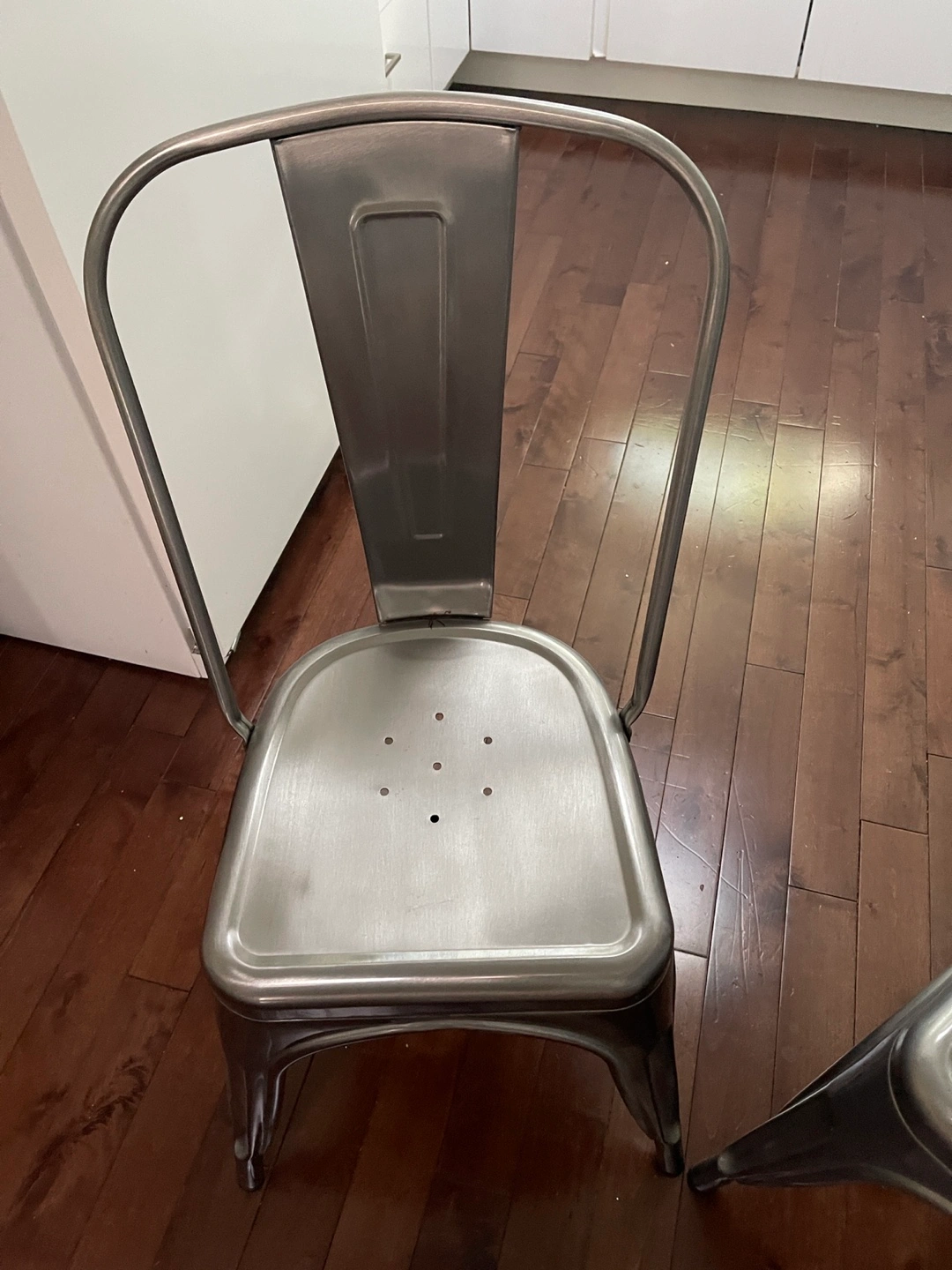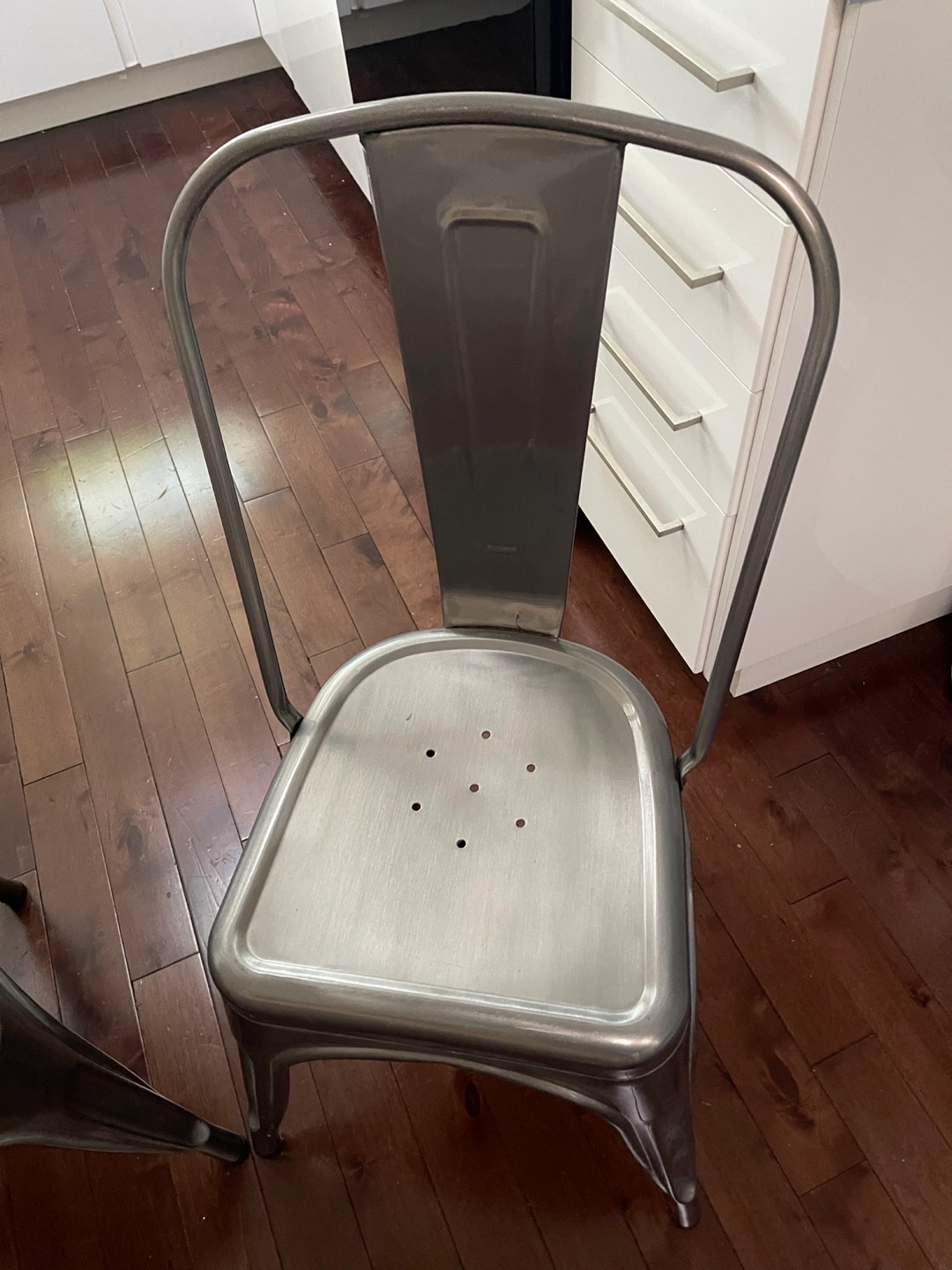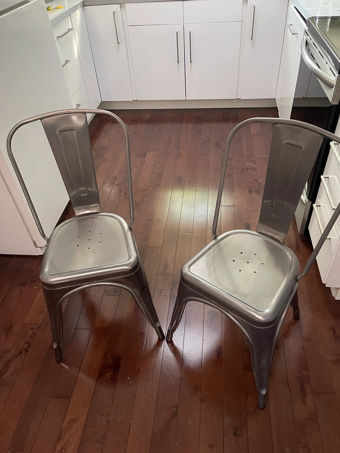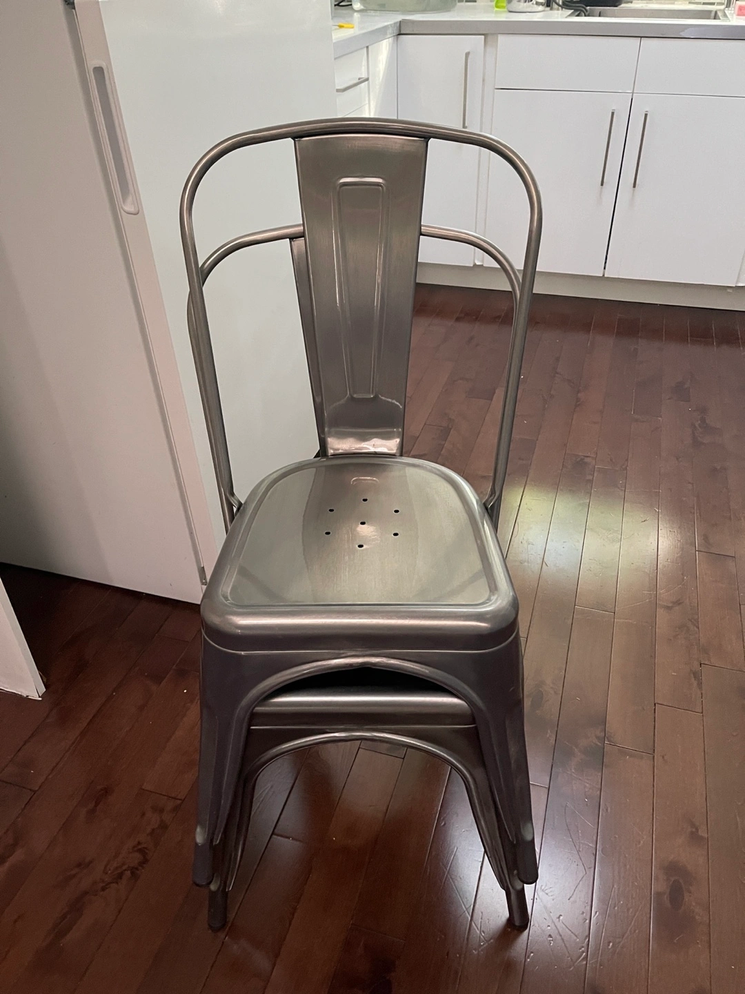 $40 for both. Selling a set of two metal stackable dining chairs! Indoor/outdoor in. The chairs have a nice industrial style and are very sturdy. You pick up at Gerrard and Jarvis. Pls include your availability in first message.