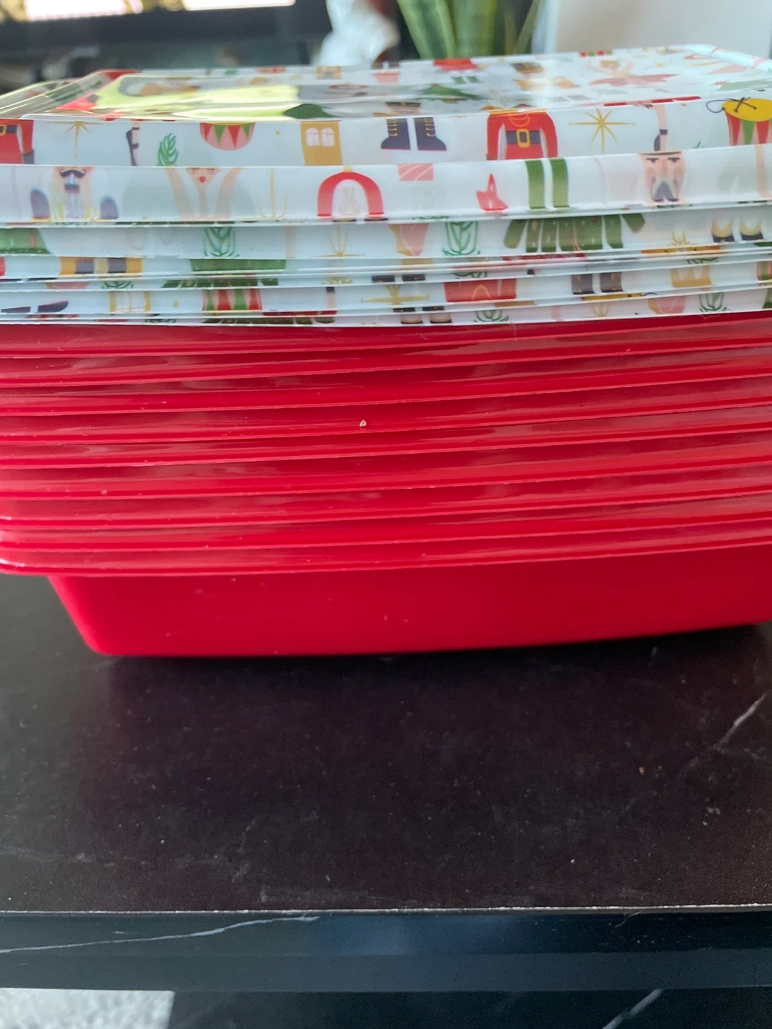 85Selling a set of stackable food storage containers. They're red with decorative lids, perfect for keeping your leftovers fresh or packing a lunch. Great for organizing your fridge or pantry!