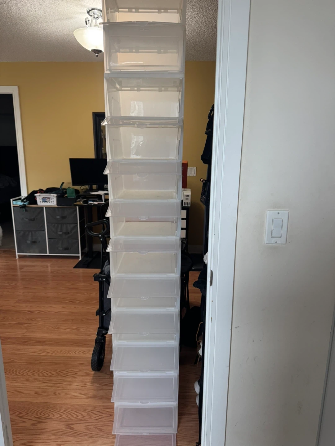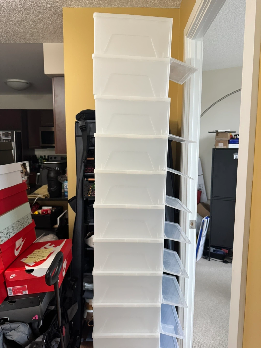 347Declutter your space with these clear stackable shoe storage boxes! They're perfect for keeping your shoes organized and easily accessible. They're in great condition and ready to help you tidy up your home. Selling the set of 12 for $80. Purchased on Amazon. I wear size 10 men’s shoes and it fits my Jordan 1 high tops.