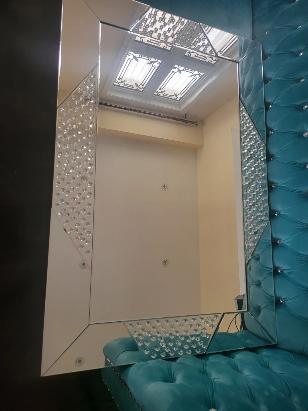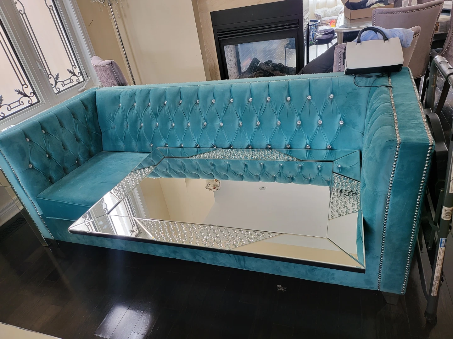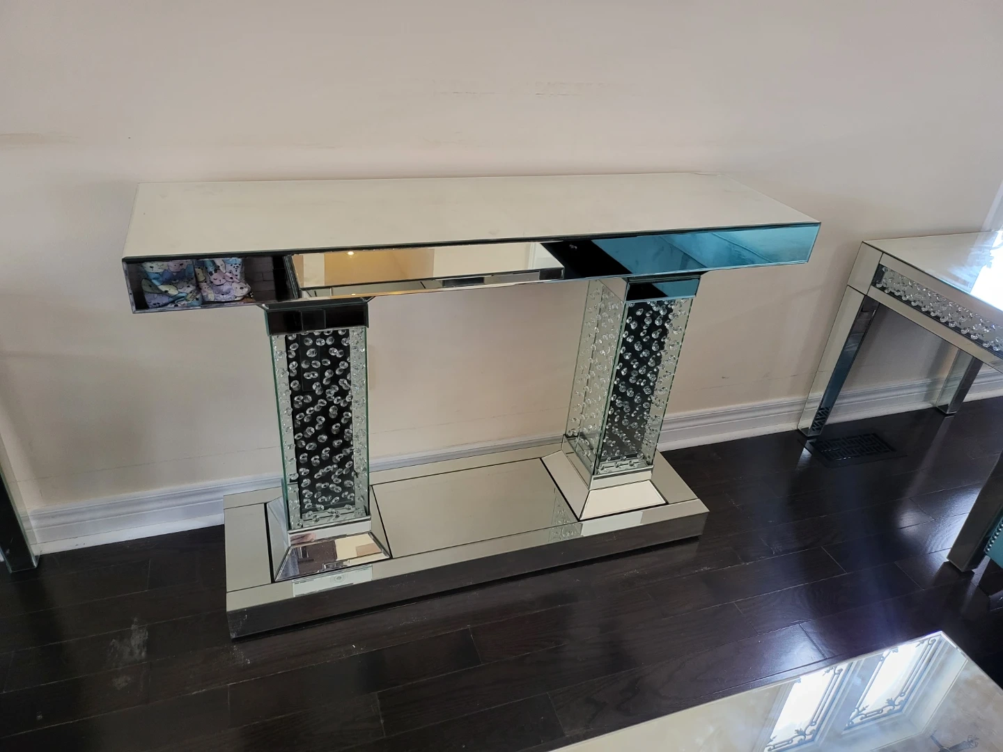 84Selling staging furniture, 2 x 3 seater couches, new condition. Plus a mirrored accent table, and 2 side tables, full mirrord rectangular mirror.. It would look great in any room! All with diamond studs. Some chips and cracks on mirrored parts. Open to offers of and close to 1500 for entire living room set