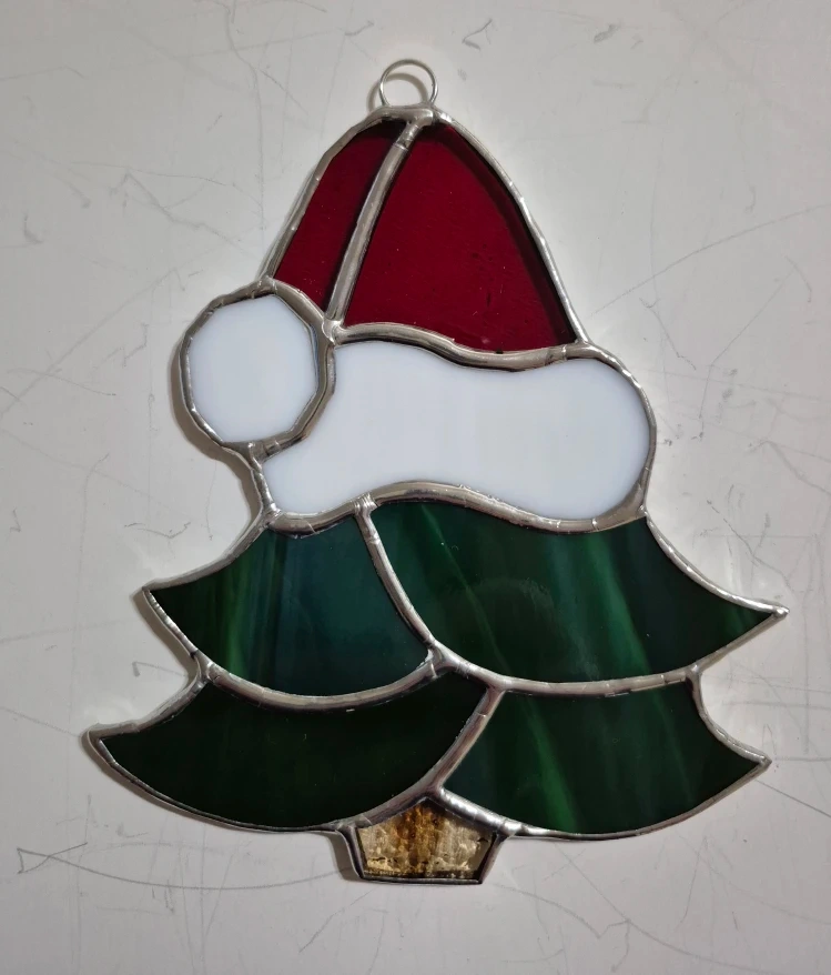 29Handmade stained glass tree ornament with santa hat. Christmas red glass and 2 toned green tree, approx size 4.5 by 5.5 inches. Could also be used for suncatcher. Pick up Pickering, cash only