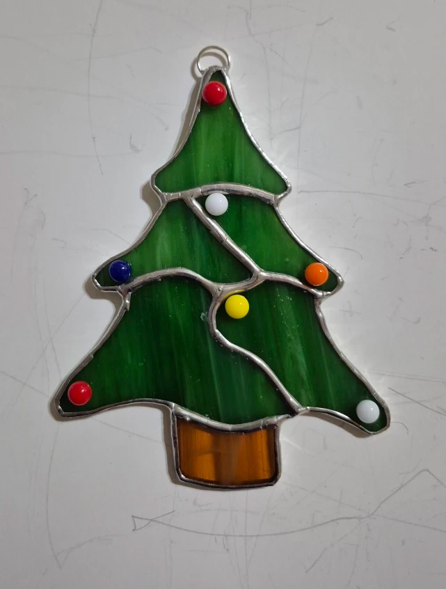 29Handmade stained glass Christmas tree ornament. 2 toned green glass with colored glass balls. Approx size 4 by 5 inches, with attached ring at top. Pick up in Pickering, cash only