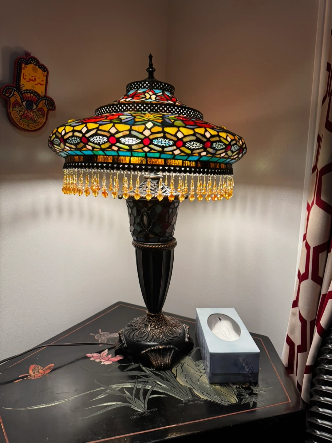 Beautiful stained glass table lamp in great condition! It stands 27.5 inches tall and 17 inches wide, making it a lovely accent piece for any room.