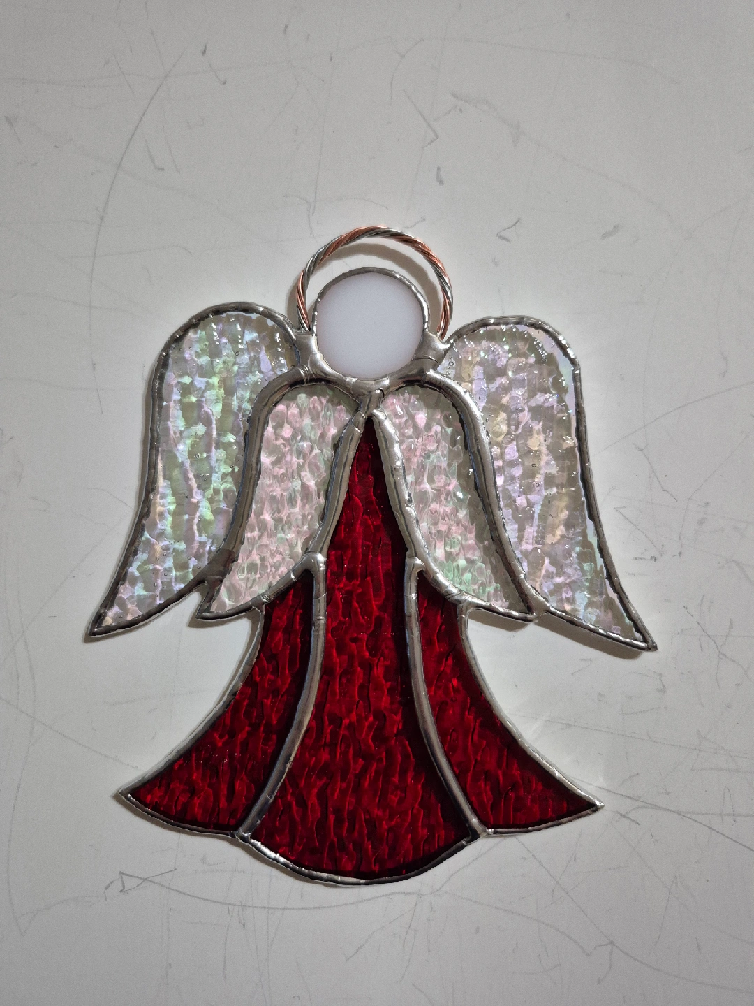 29Handmade stained glass red angel suncatcher. Christmas red textured glass with iridescent textured glass wings. Approx size 5 by 5.75 inches Pick up in Pickering, cash sale only