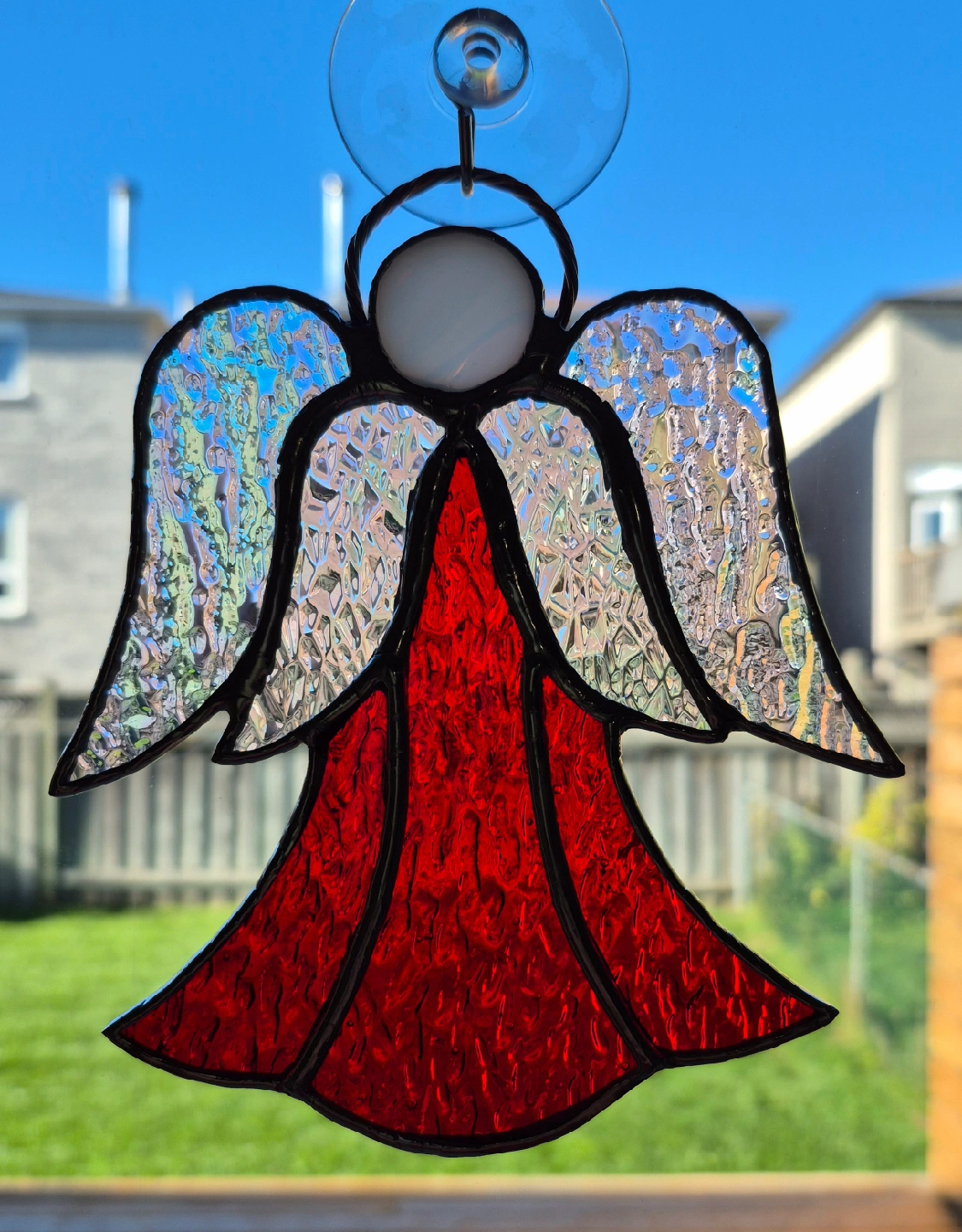 29Handmade stained glass red angel suncatcher. Christmas red textured glass with iridescent textured glass wings. Approx size 5 by 5.75 inches Pick up in Pickering, cash sale only