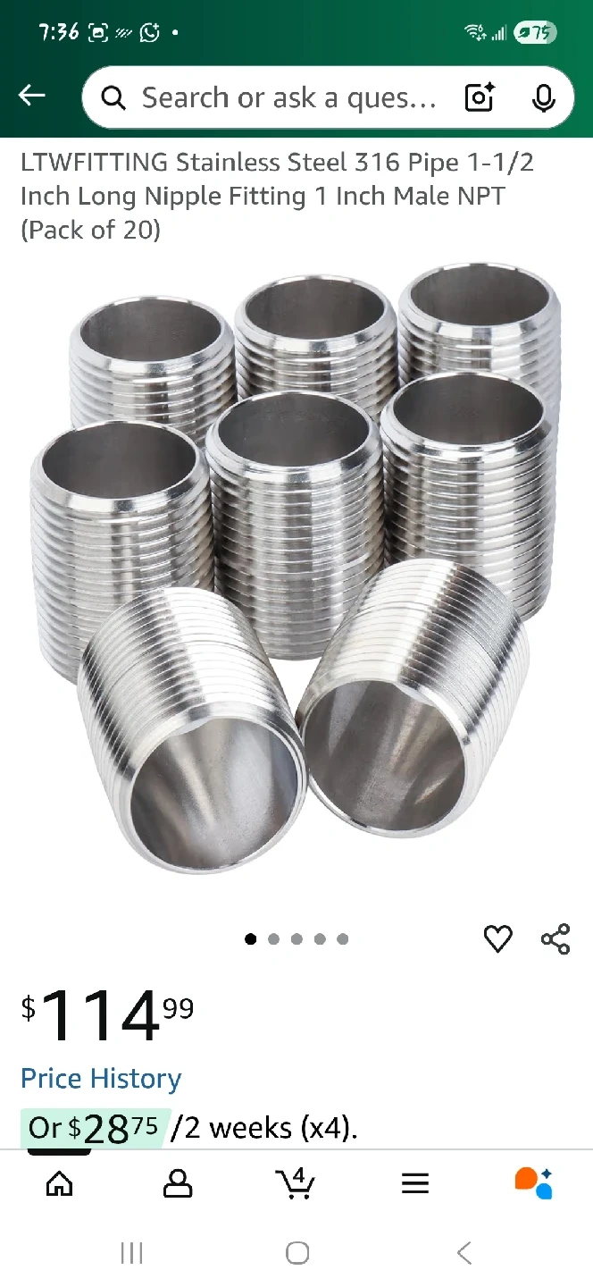 75Selling a pack of 6 stainless steel 316 pipe nipples. They are 1-1/2 inch long with a 1 inch male NPT.