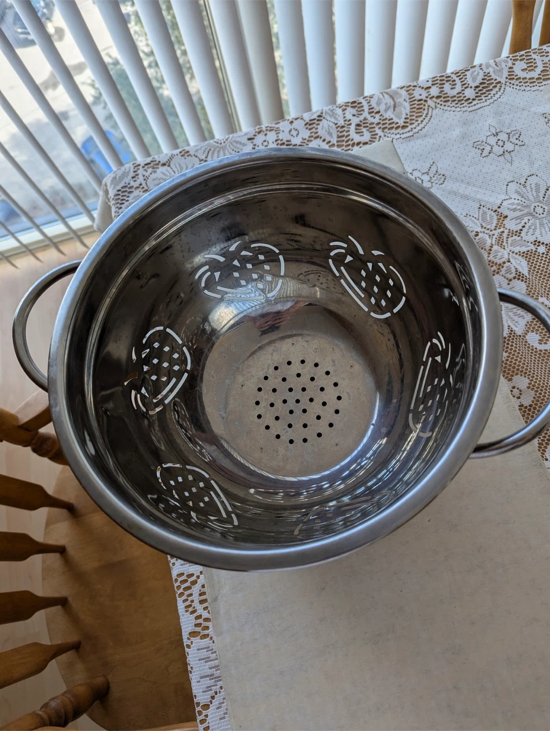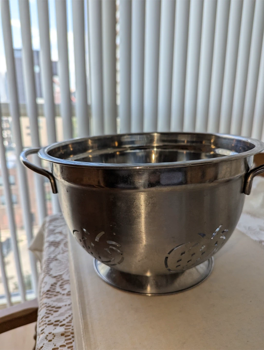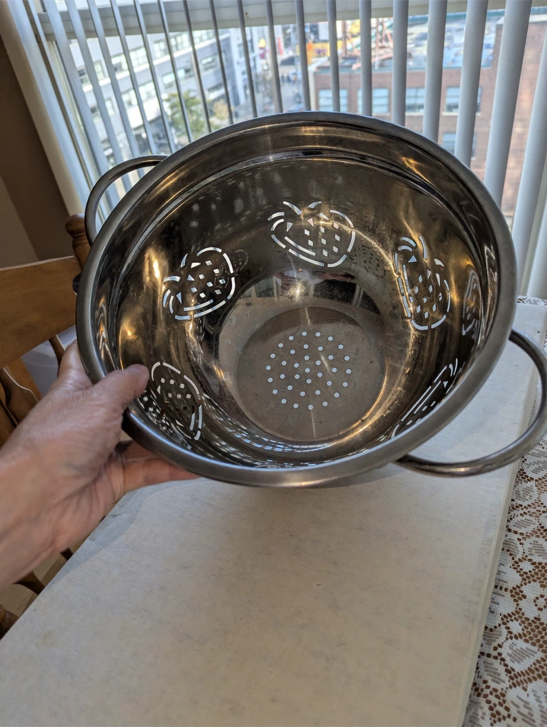 Selling a large stainless steel colander. It's in great shape and ready for a new home! It has handles for easy use and a sturdy base.