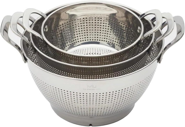 91This listing is for a set of 3 stainless steel colanders, perfect for any kitchen. These colanders have been lightly used and are in good condition, ready for all your straining and rinsing needs. The set includes three different sizes to accommodate various amounts of food, making them versatile for everything from draining pasta to washing fruits and vegetables. * Durable stainless steel construction * Set includes 3 sizes * Easy to clean * Perfect for draining pasta, rinsing vegetables, and more Fast- draining 18/8 Stainless Steel Colanders are sized for everything from fruit snd vegetables to pasta , with 2mm perforations that are small enough for straining ingredients like rice and beans. Extra large handles for stability. These colanders will nest for storage. If the ad is up, the colanders are available!