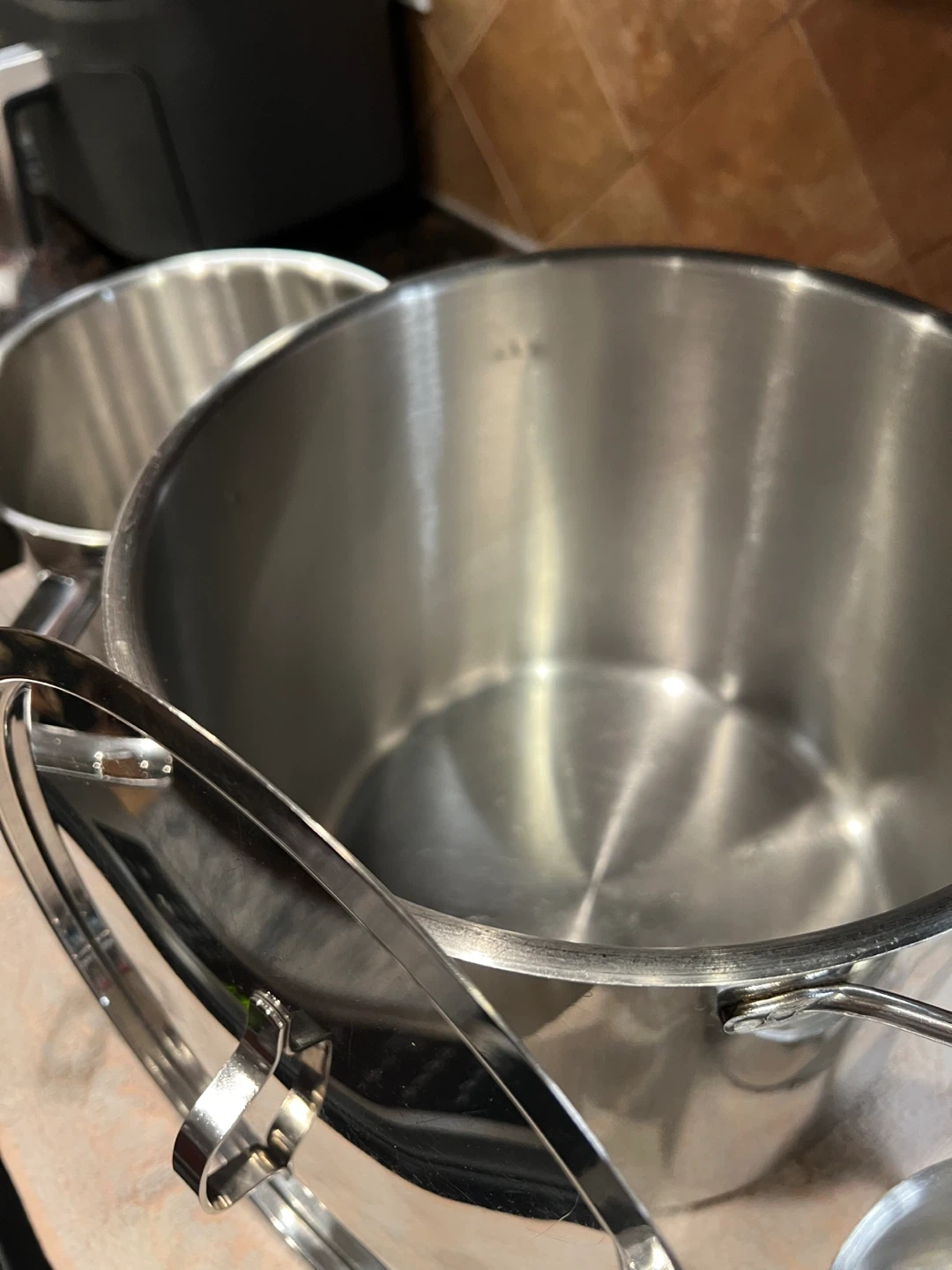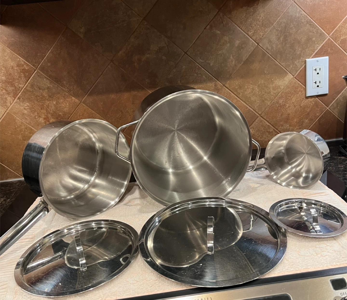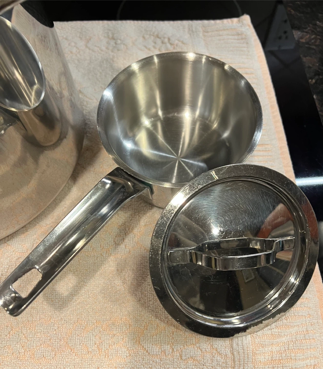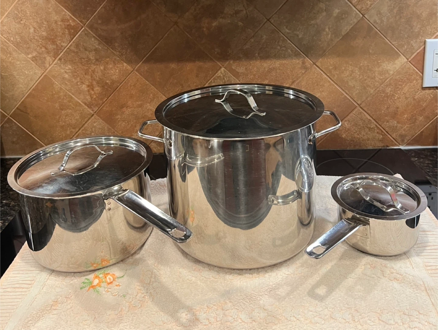 579Set of 3 pots Large stock pot (about 11 L capacity and measuring 8.75” x 10”) Medium pot (about 4.5 L capacity and measuring 5.5” x 8.5”) Small saucepan (about 600 mL capacity and measuring 3” x 5.25”) Very good clean condition Perfect starter set!! Asking $30/Sold as a set of 3 Interested? Message me and please check my other listings…