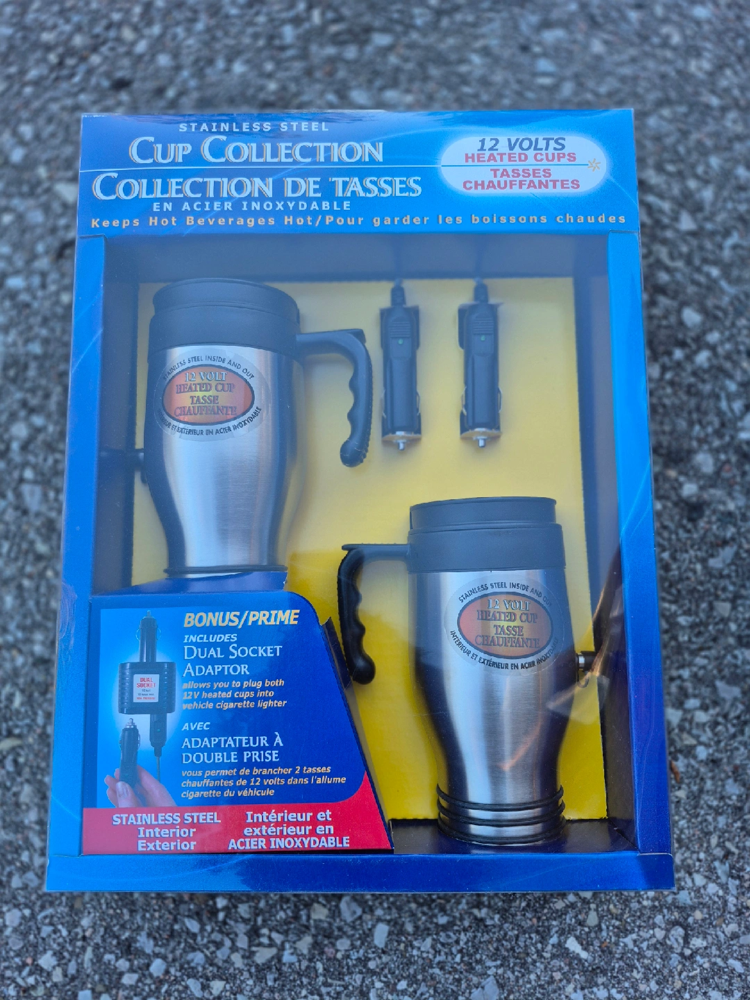 60Keep your beverages warm on the go with this stainless steel cup collection! These 12V heated mugs are perfect for your car, plugging right into the cigarette lighter socket. They fit in most vehicle cup holders and have a capacity of 450 ml/15 oz. The stainless steel construction ensures durability, and the comfort grip handle makes them easy to hold. Includes a dual socket adaptor!