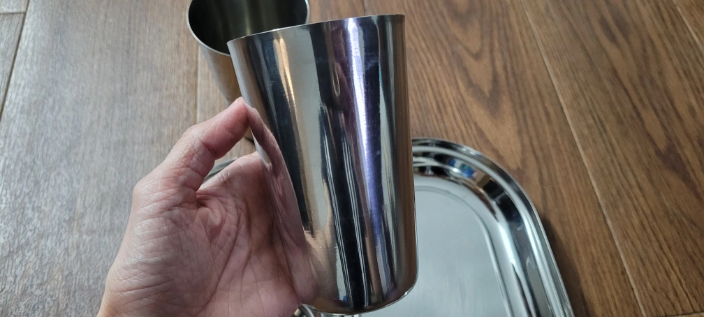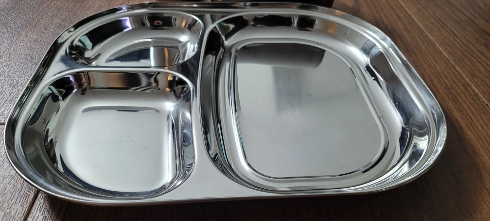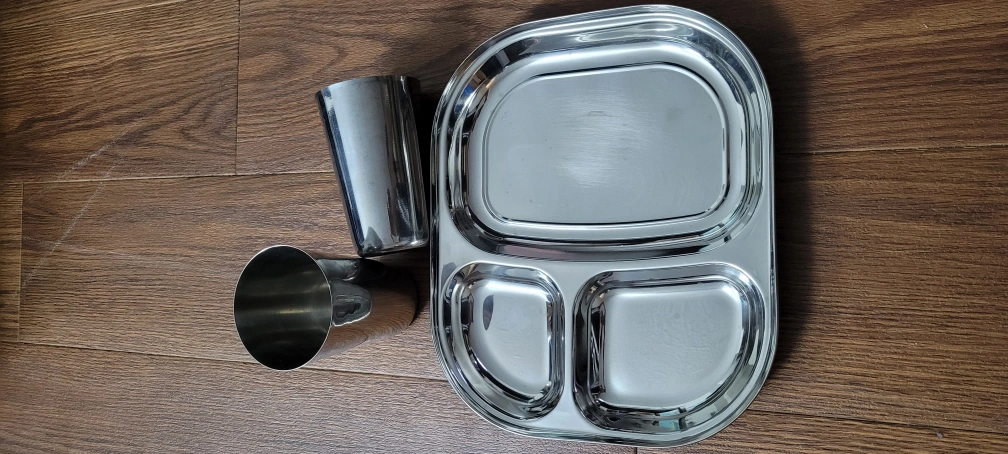 Selling a set of stainless steel cups and a compartment tray. Perfect for everyday use! The cups are a great size for drinks, and the tray is ideal for organizing snacks or meals. They're in brand new condition and ready for a new home