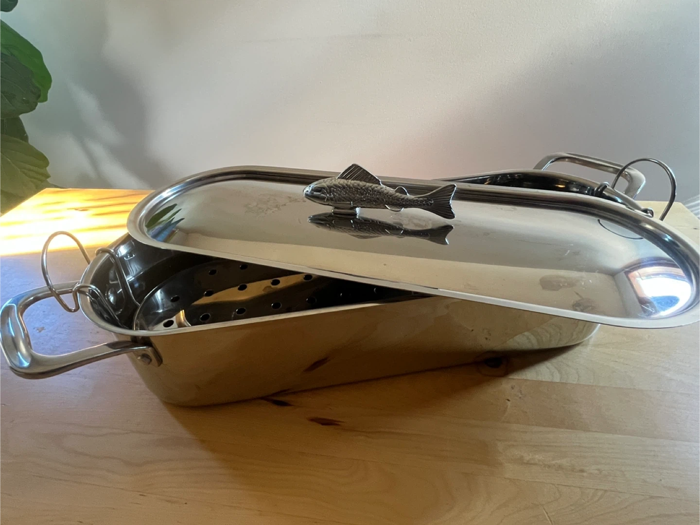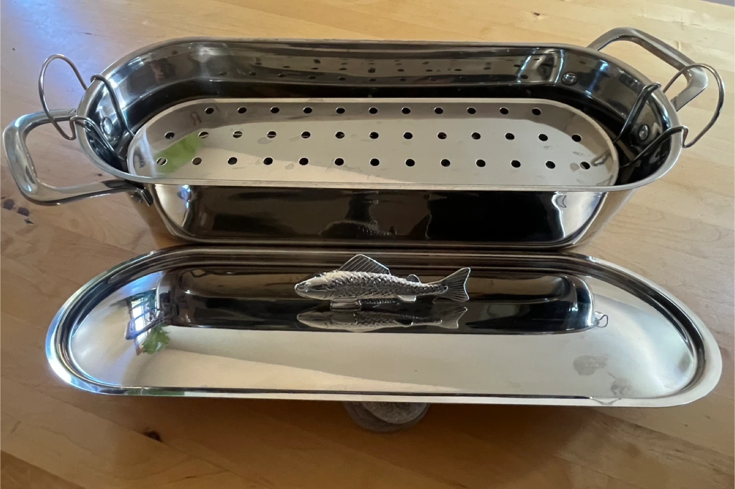 18Selling a stainless steel fish poacher, complete with a steamer insert and a lid featuring a charming fish handle! It's in great shape and ready to help you cook up some delicious, healthy meals. Perfect for poaching fish or steaming veggies. It's a great addition to any kitchen!