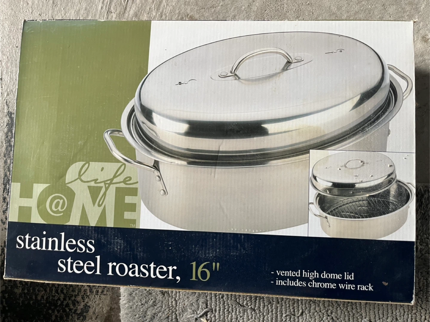 52Selling a stainless steel roaster. It's 16 inches and comes with a vented high dome lid and a chrome wire rack. Used once so in good condition. Perfect for cooking turkeys or whole chickens.