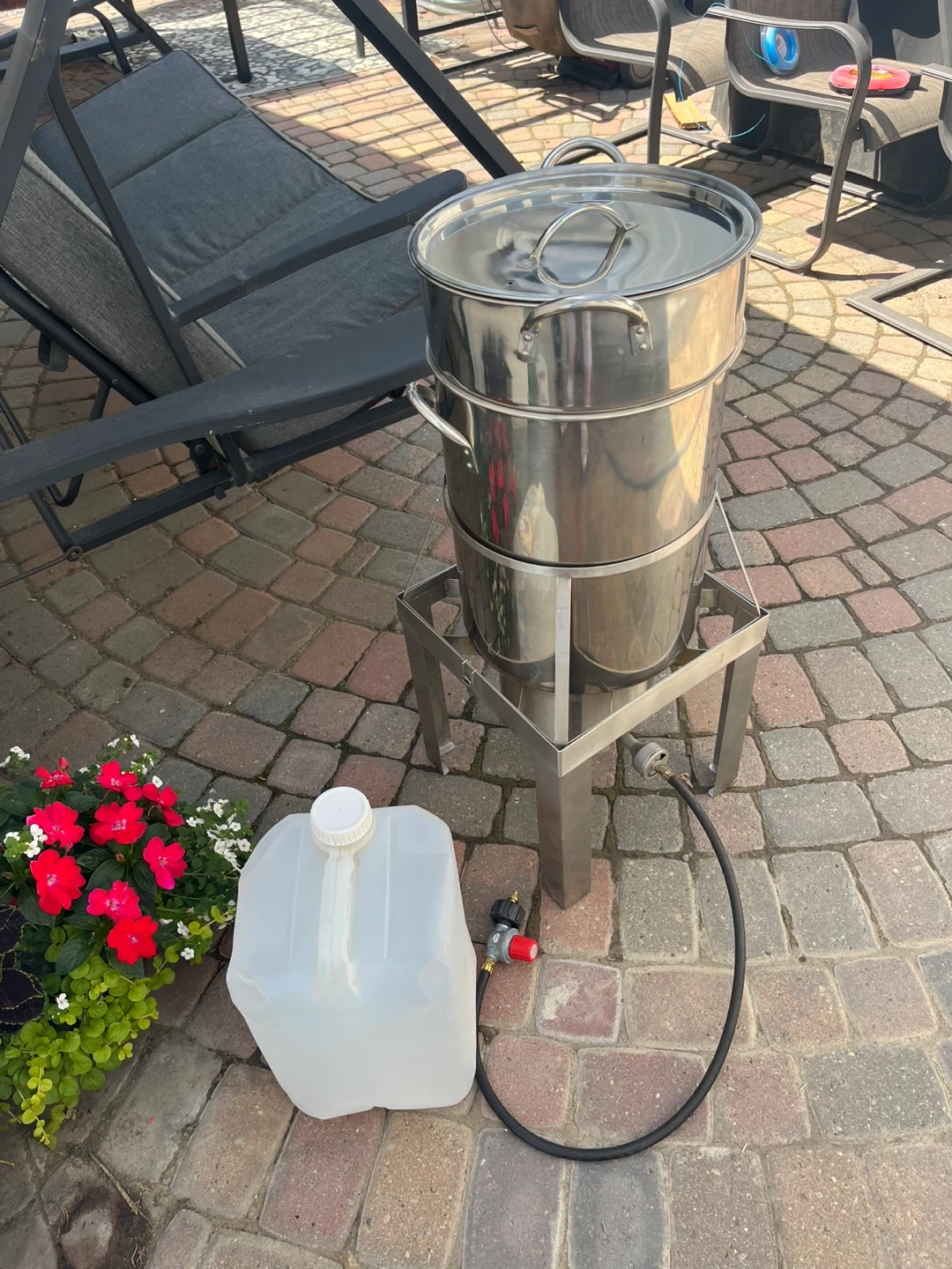 20Stainless steel steamer pot with a stand and propane hookup. Perfect for outdoor cooking or large batch steaming. 32 quart turkey fryer. Includes propane tank. Used once and only once.