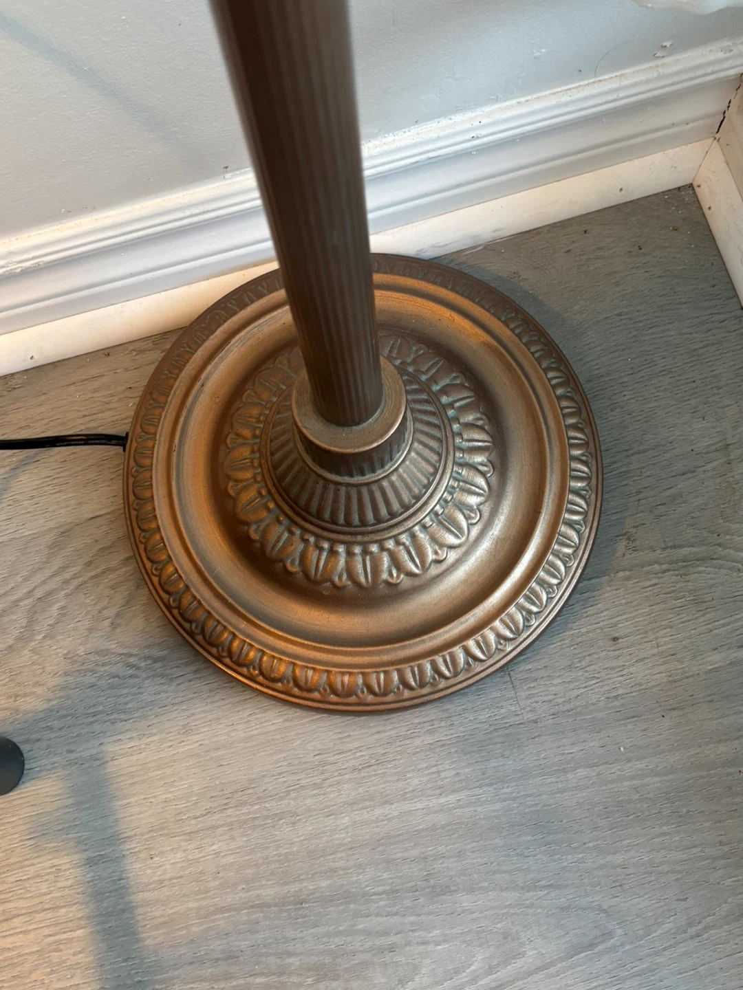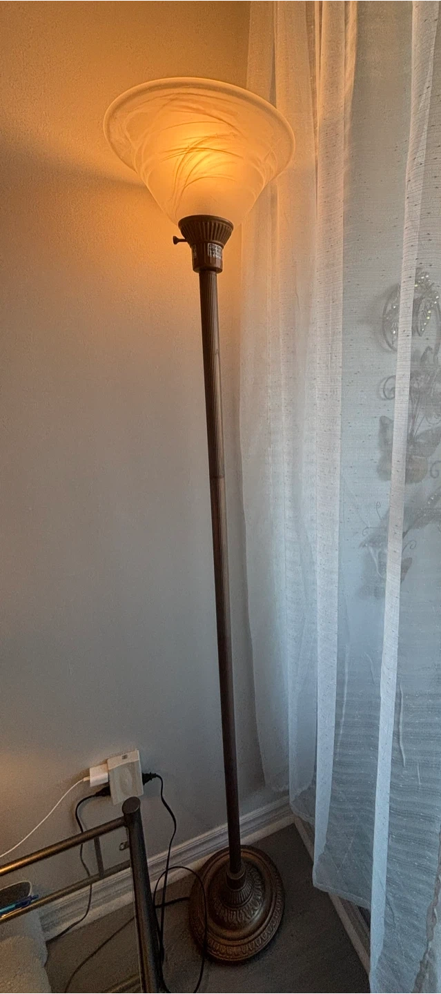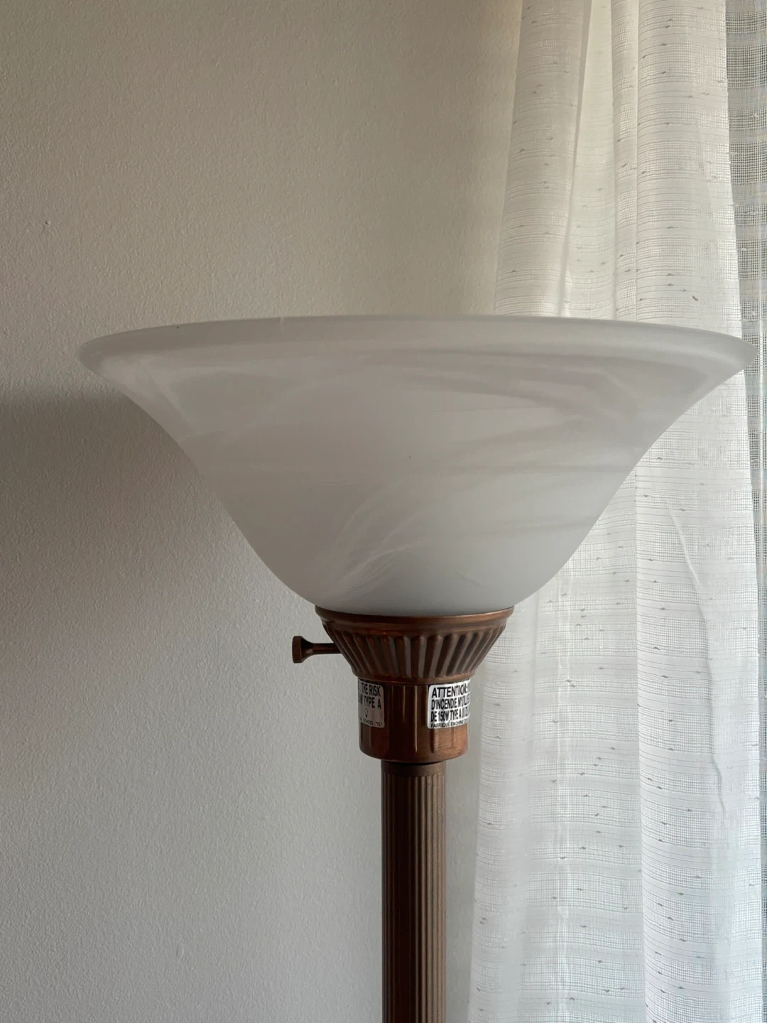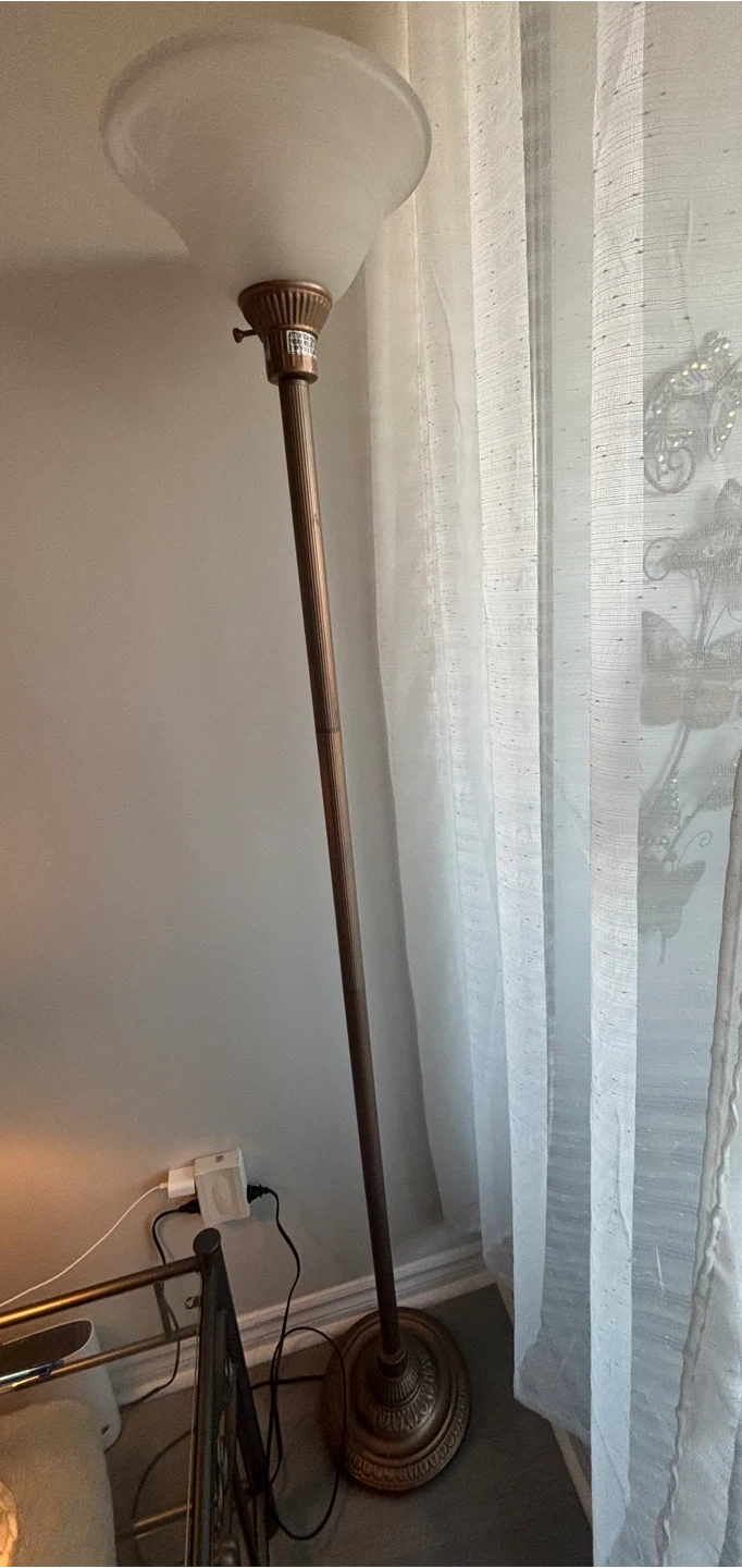 Illuminate your living space with this beautiful torch lamp, featuring a sleek design and warm ambient lighting. This floor lamp stands tall and adds a touch of elegance to any room. The condition is good, with minor signs of wear that add to its character. This lamp provides a cozy atmosphere perfect for reading or relaxing. * **Type:** Floor Lamp * **Style:** Torch * **Material:** Metal * **Color:** Bronze/Gold If you're reading this, the torch lamp is still available! Don't miss out on adding this stunning piece to your home decor. Grab it before it's gone!