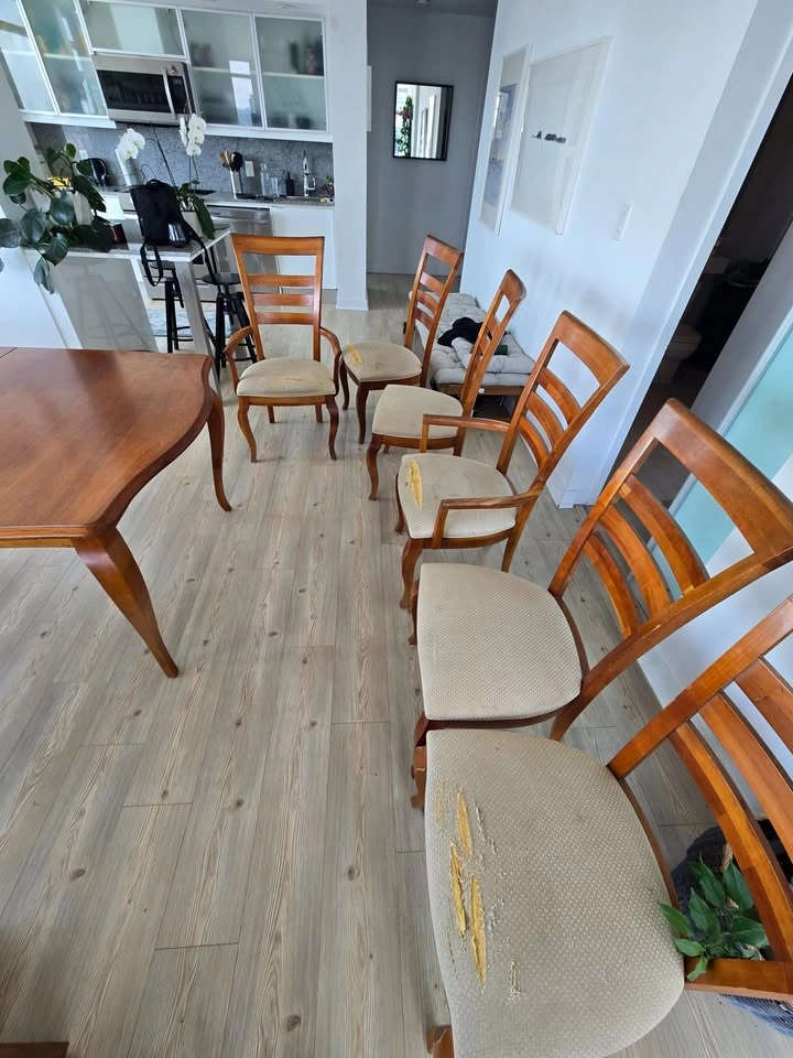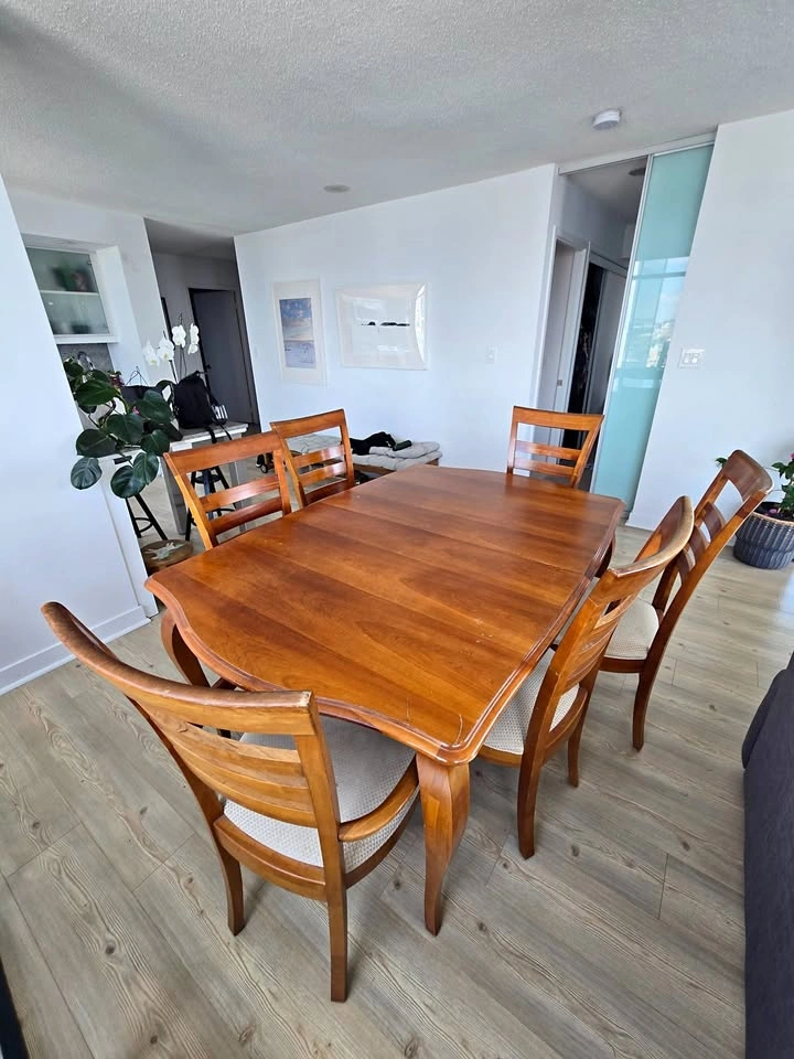 Solid wood Made in USA dining set by Stanley Furniture. πŸͺ΅ Table: 66” x 44” Includes two 20” leaves β†’ extends to 106” Very sturdy and in good condition overall, just light surface scratches on table πŸͺ‘ Chairs: 6 matching chairs included Frames are solid, upholstery is worn and needs recovering (DIY project or replace cushions) $99 OBO β€” Pickup near Spadina & Front (Table alone of this quality sells for $700+. Priced lower due to chair fabric condition.)