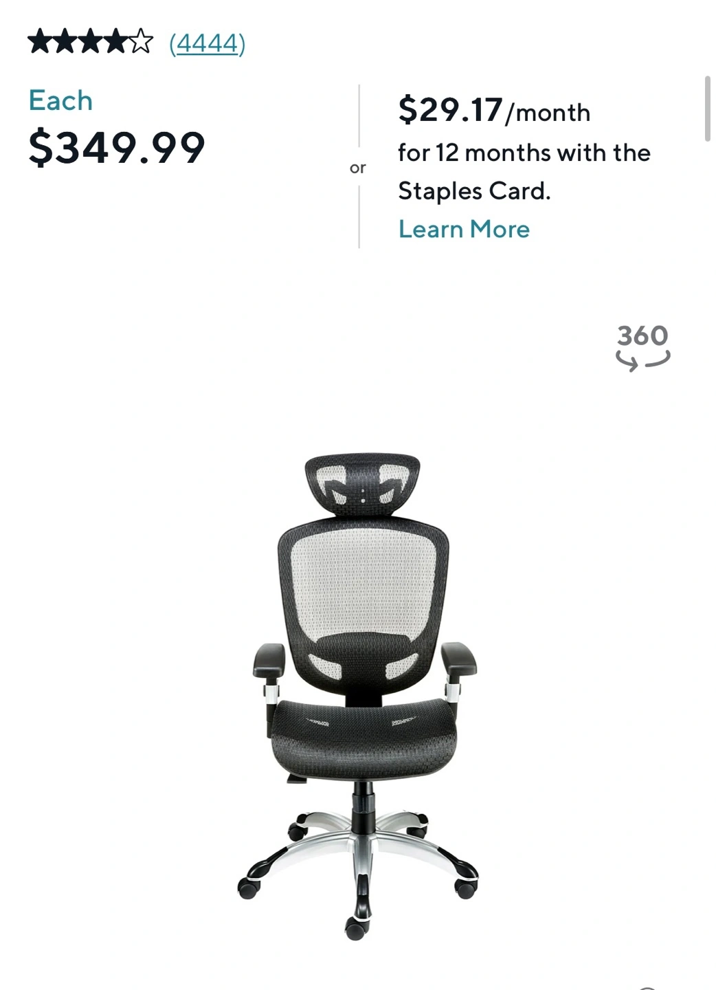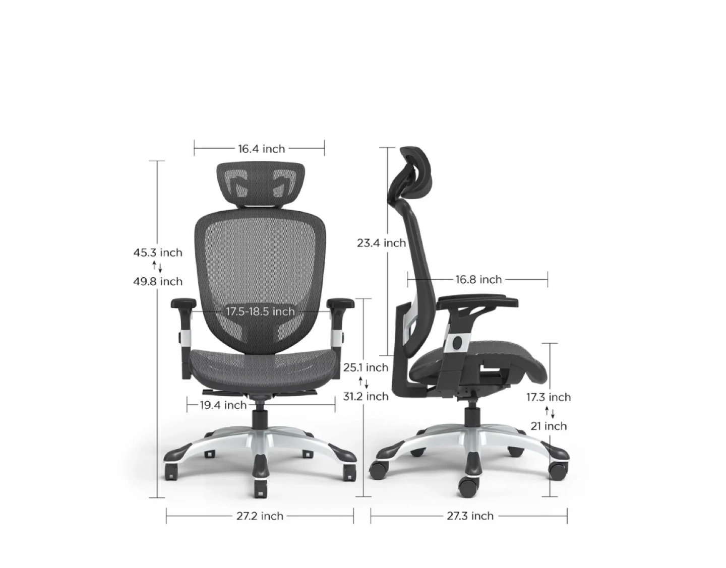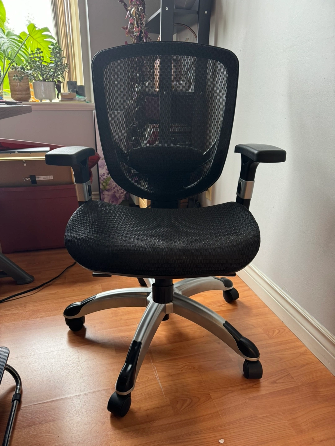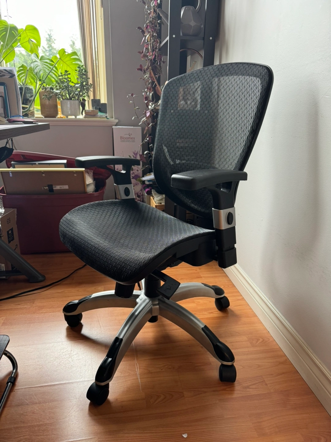 10Comfortable mesh office chair with adjustable headrest and armrests. Silver base with black mesh back and seat. Provided lumbar support . Seat and back are adjustable. Good condition, barely used, like new.