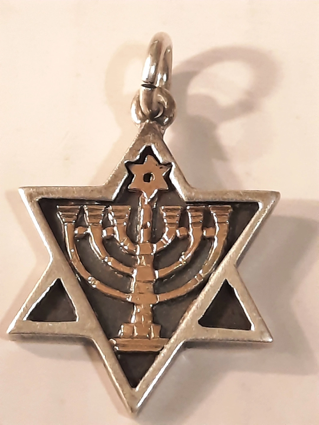 Here's a Star of David pendant featuring a menorah design! It's made of 14ct gold and 925 silver, making it a lovely piece. It weighs 3.90 grams