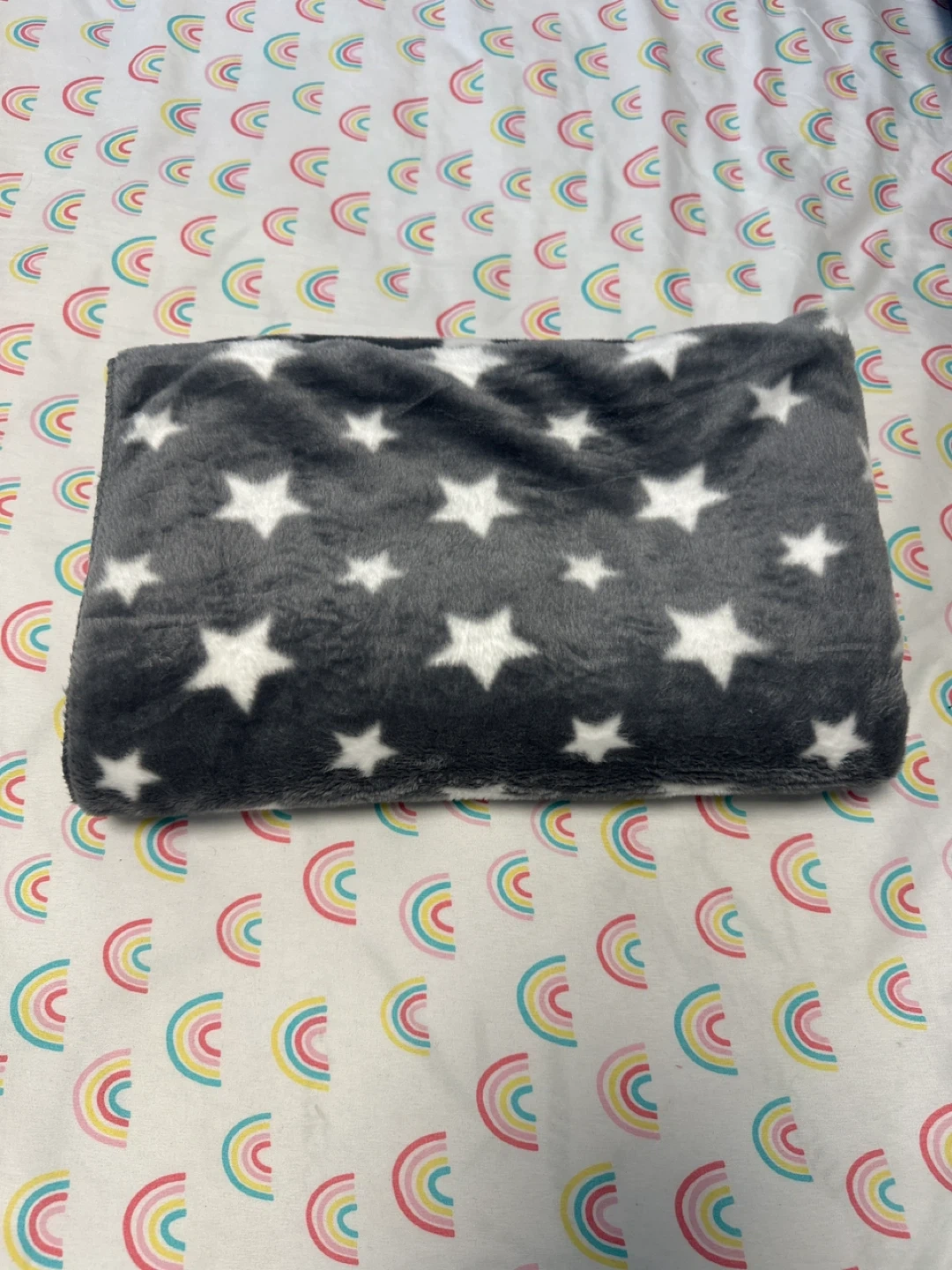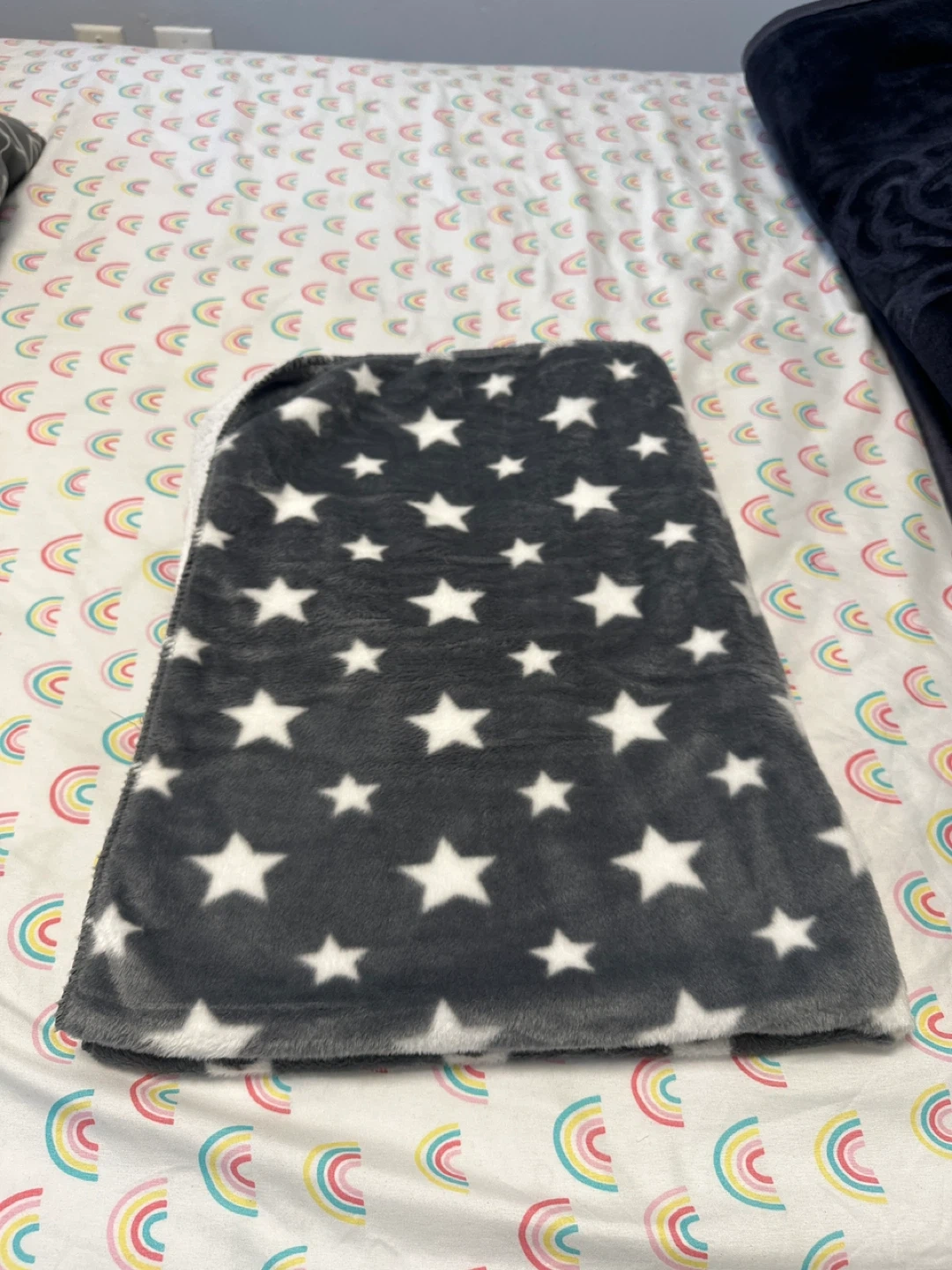 Selling a cozy fleece blanket with a cute star pattern! It's grey with white stars on one side and a soft, fluffy white fleece on the other. Perfect for snuggling up on the couch or adding a touch of warmth to your bed
