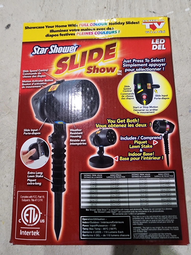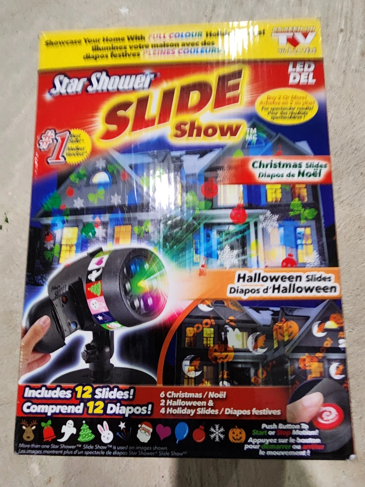 10Showcase your home with this Star Shower Slide Show! It projects full colour holiday slides. Includes 12 slides (6 Christmas, 2 Halloween, and 4 holiday slides). It also includes a lawn stake and indoor base purchase last year never opened complete set, open to the best price