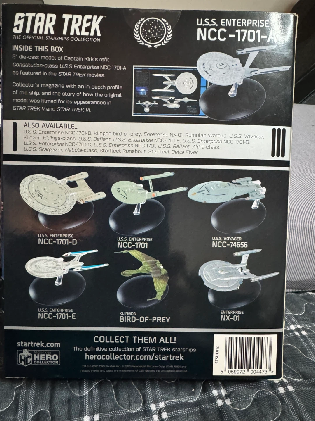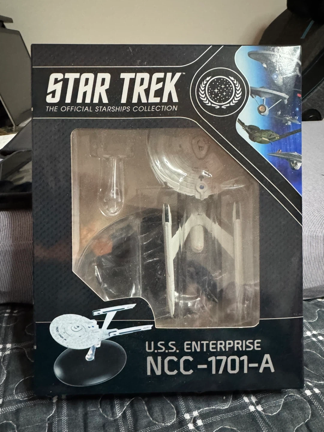 Selling a Star Trek U.S.S. Enterprise NCC-1701-A die-cast model from The Official Starships Collection! The box includes a 5" die-cast model of Captain Kirk's refit Constitution-class U.S.S. Enterprise NCC-1701-A, as featured in the STAR TREK movies. Also included is a collector's magazine with an in-depth profile of the ship and the story of how the original model was filmed for its appearances in STAR TREK V and STAR TREK VI