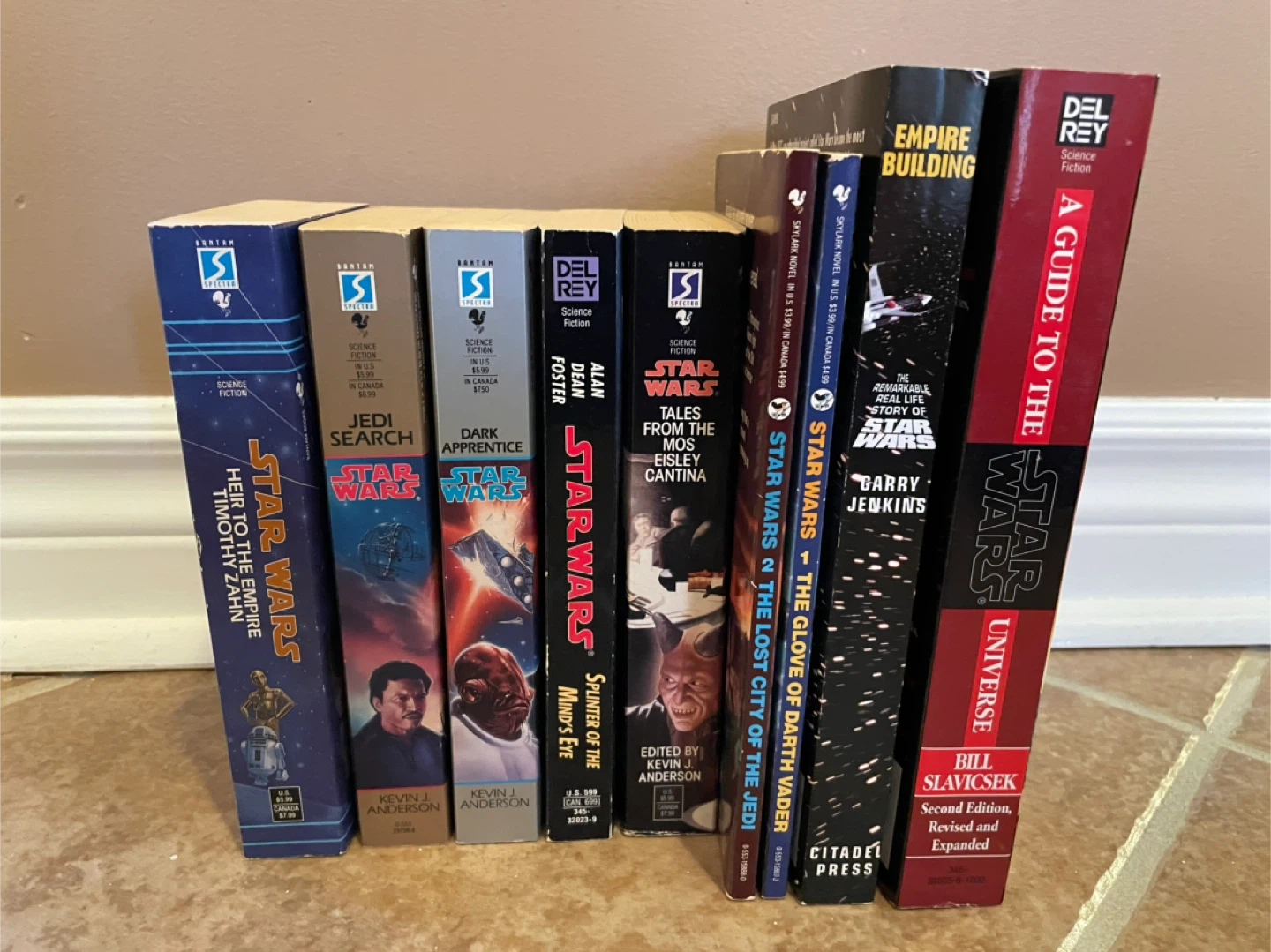 76Selling a collection of Star Wars books! Some novels, some kids books. Plus Star Wars movie and lore stuff. Titles include: - Empire Building: The Remarkable Real-Life Story of Star Wars by Garry Jenkins - Star Wars Volume 1: Heir to the Empire by Timothy Zahn - A Guide to the Star Wars Universe by Bill Slavicsek