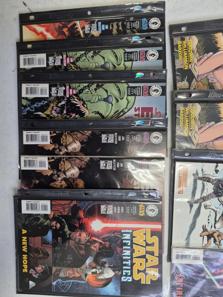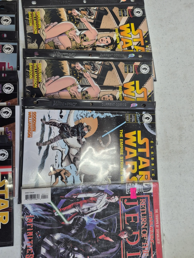 75Selling a collection of Star Wars comic books. Titles include Classic Star Wars: The Empire Strikes Back, Return of the Jedi, and Star Wars Infinities: A New Hope. All comics are in protective sleeves.