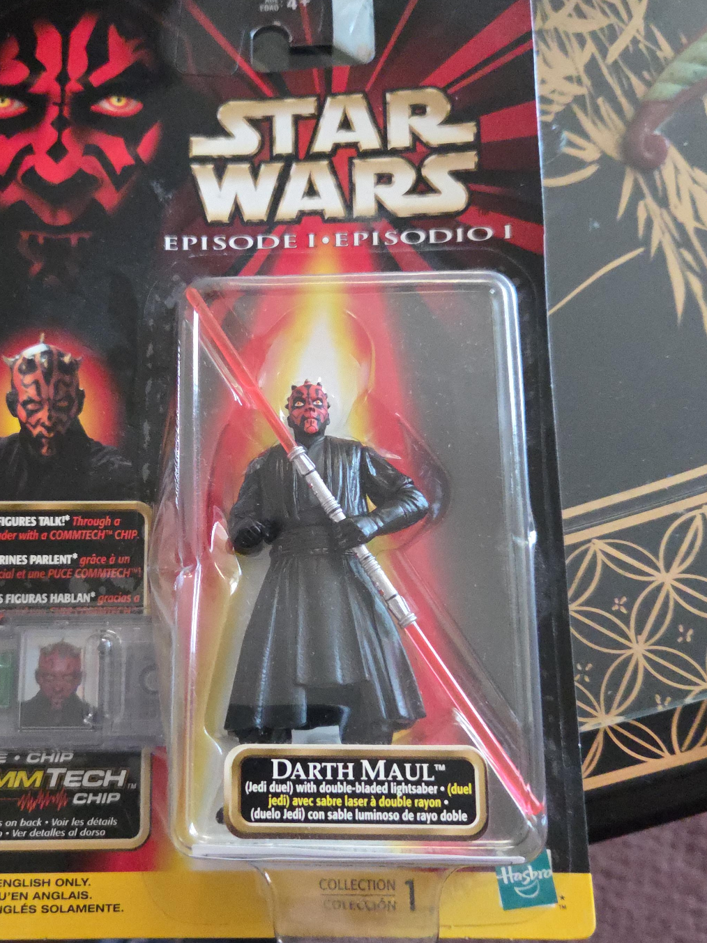 Selling a Star Wars Episode 1 Darth Maul action figure. It's still in its original packaging. The figure has a COMMTECH chip. Made in China. A great collectible for any Star Wars fan!