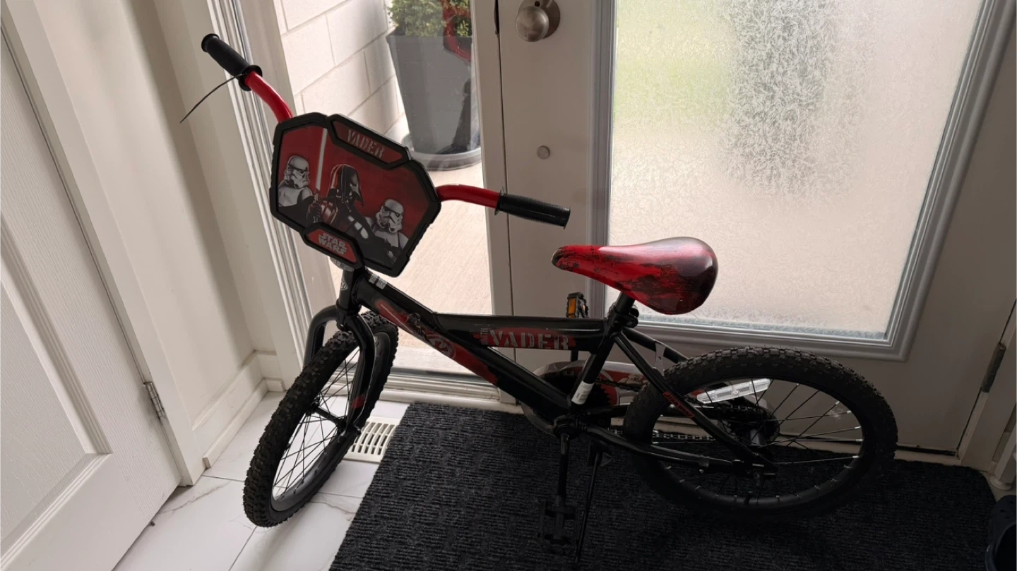 Selling a Star Wars Darth Vader 18” bike! It's black and red, and features Darth Vader and Stormtroopers on the front. Perfect for a young Star Wars fan!